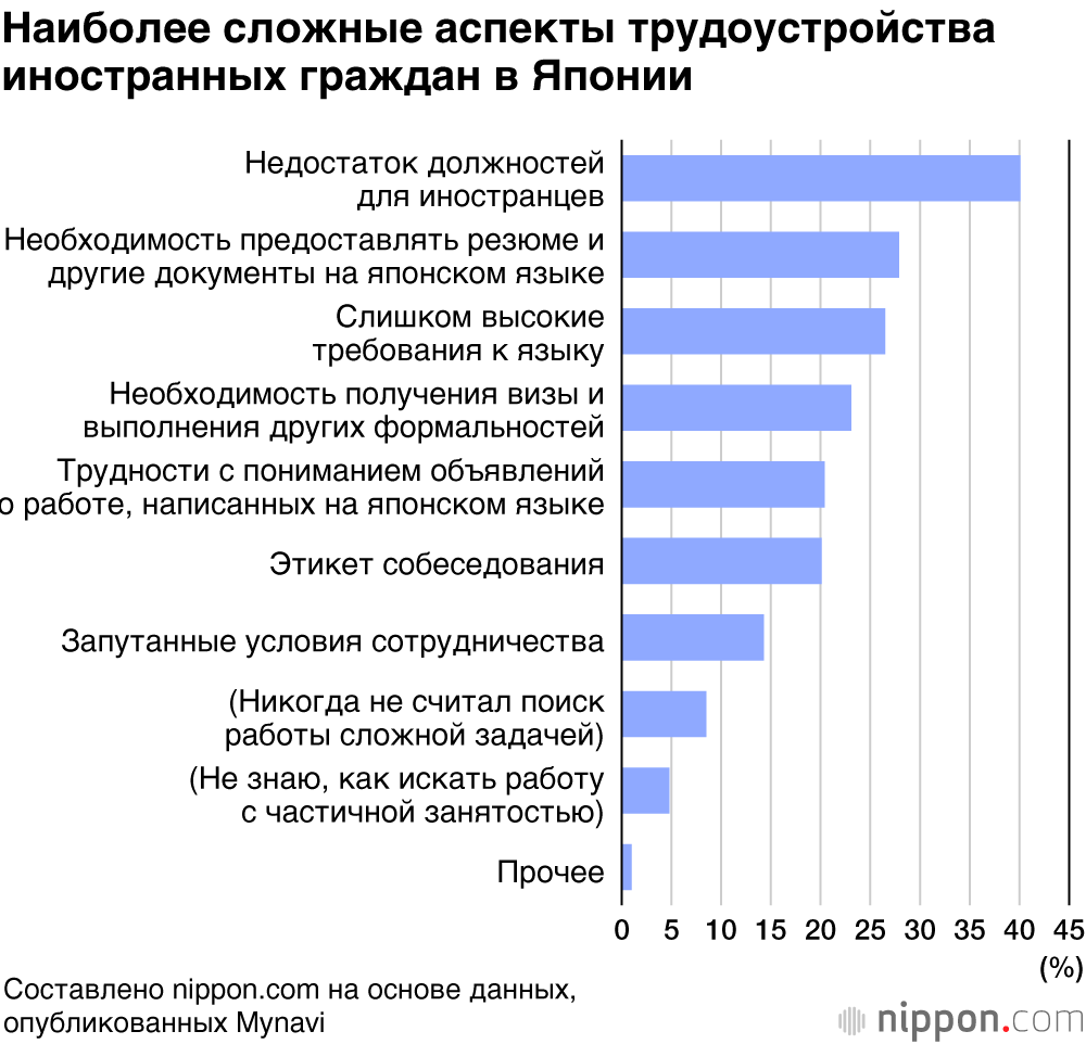 Недавнее исследование, проведенное кадровым агентством Mynavi, показало, что около 40% иностранцев, проживающих в Японии и работающих по графику неполного рабочего дня, считают, что для неяпонцев открыто слишком мало вакансий. Когда их спросили о других аспектах поиска работы, которые они сочли трудными, наиболее распространенными ответами оказались следующие: необходимость готовить свое резюме и другие документы на японском языке, требования к языку и сложность понимания объявлений о работе, написанных на японском языке.