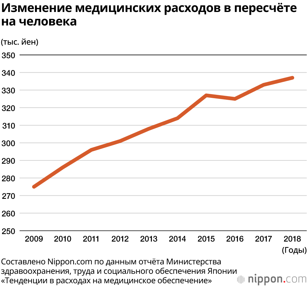 В 2014 году медицинские расходы составляли 314 000 йен на человека, и за последние пять лет выросли на 7,3% (23 000 йен).