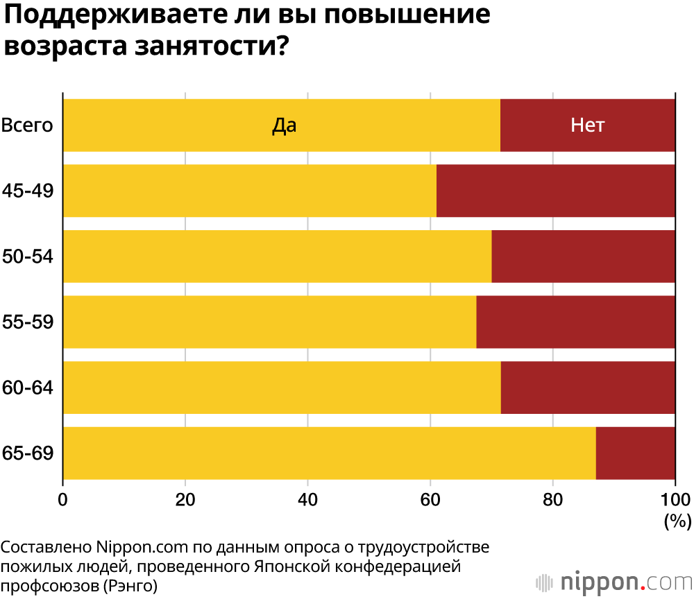 Исследование, проведенное в декабре 2019 года Японской конфедерацией профсоюзов (Рэнго), показало, что 69,8% опрошенных знают об обсуждении в правительстве вопроса о расширении занятости для пожилых людей; 71,4% одобряют идею продвижения политики для обеспечения возможностей трудоустройства в возрасте до 70 лет. Особенно высоким уровень одобрения был у тех, кому скоро 70, то есть в возрастной группе 65-69 лет, он составил 87%.