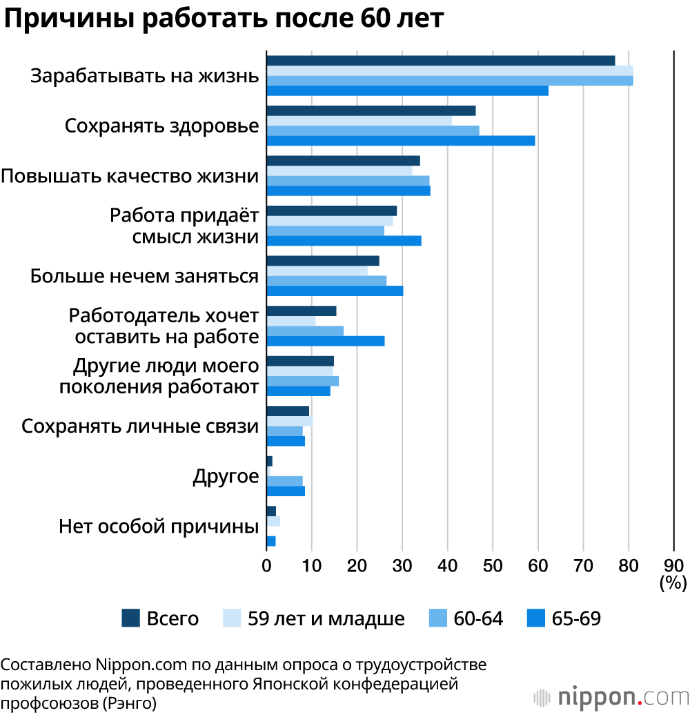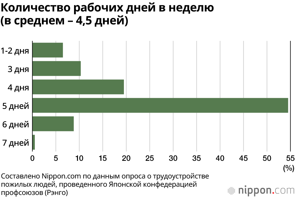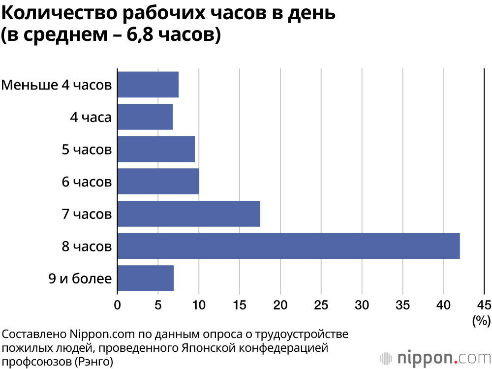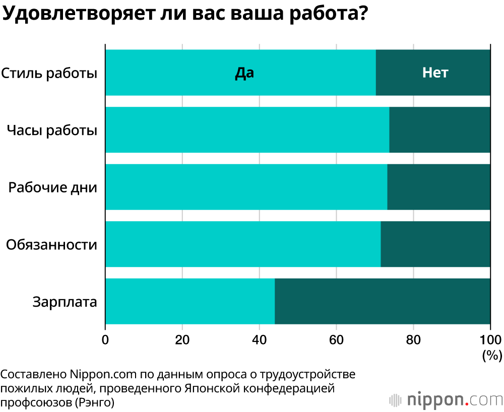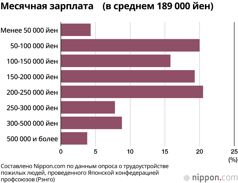Опрос показал, что большинство из работающих людей старше 60 лет в настоящее время работают по восемь часов в день пять дней в неделю. Ежемесячная заработная плата колеблется между 50 000 и 250 000 йен, при этом средняя зарплата составляет 189 000 йен. Средняя заработная плата среди тех, кто работал на постоянной основе, была выше – 331 000 йен, что более чем вдвое превышает зарплату в 130 000 йен у людей на временной занятости с краткосрочными контрактами.