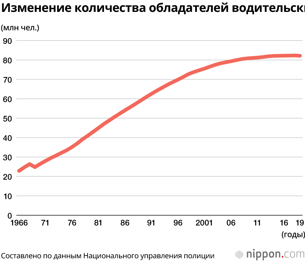 Согласно статистике водительских прав, которую ежегодно в марте публикует Национальное управление полиции, число владельцев водительских прав в 2019 году составило около 82,16 млн, что на 150 000 меньше, чем в предыдущем году. С 1969 года, когда в Японии правами владело около 24,78 миллиона человек, оно постоянно увеличивалось, но темпы роста замедлились примерно с 2014 года (в это число входят все водительские права, такие как крупногабаритные, двухколёсные и другие транспортные средства; в случае наличия нескольких видов прав у одного человека учитываются только права более высокого уровня).