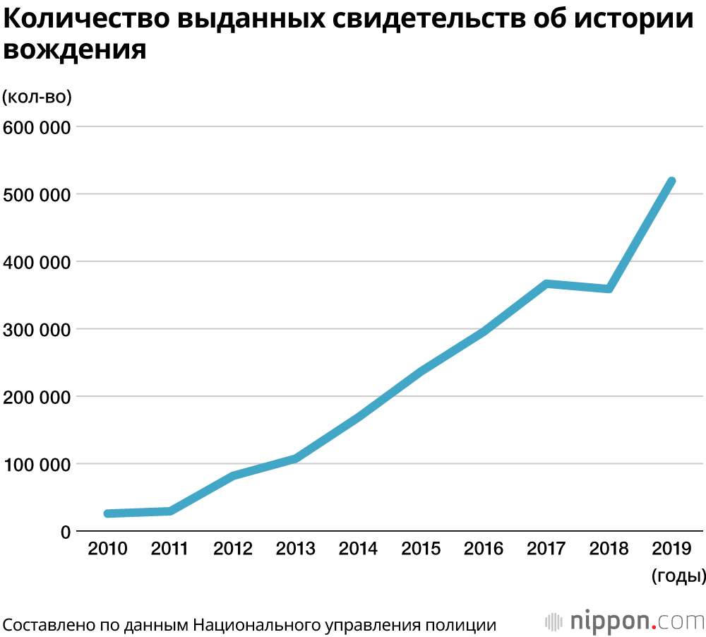 С другой стороны, в последние годы значительно увеличилась выдача свидетельств об истории вождения, которые начали выдавать в 2002 году. После начала выдачи число выданных свидетельств незначительно увеличивалось в течение примерно 10 лет, но с 2012 года резко выросло после того, как они были признаны такими же удостоверениями личности, как и водительские права. После этого тенденция роста, вероятно, продолжалась из-за сообщений о дорожно-транспортных происшествиях с участием пожилых водителей, и в 2019 году было выдано около 520 000 свидетельств – на 160 000 больше, чем годом ранее.