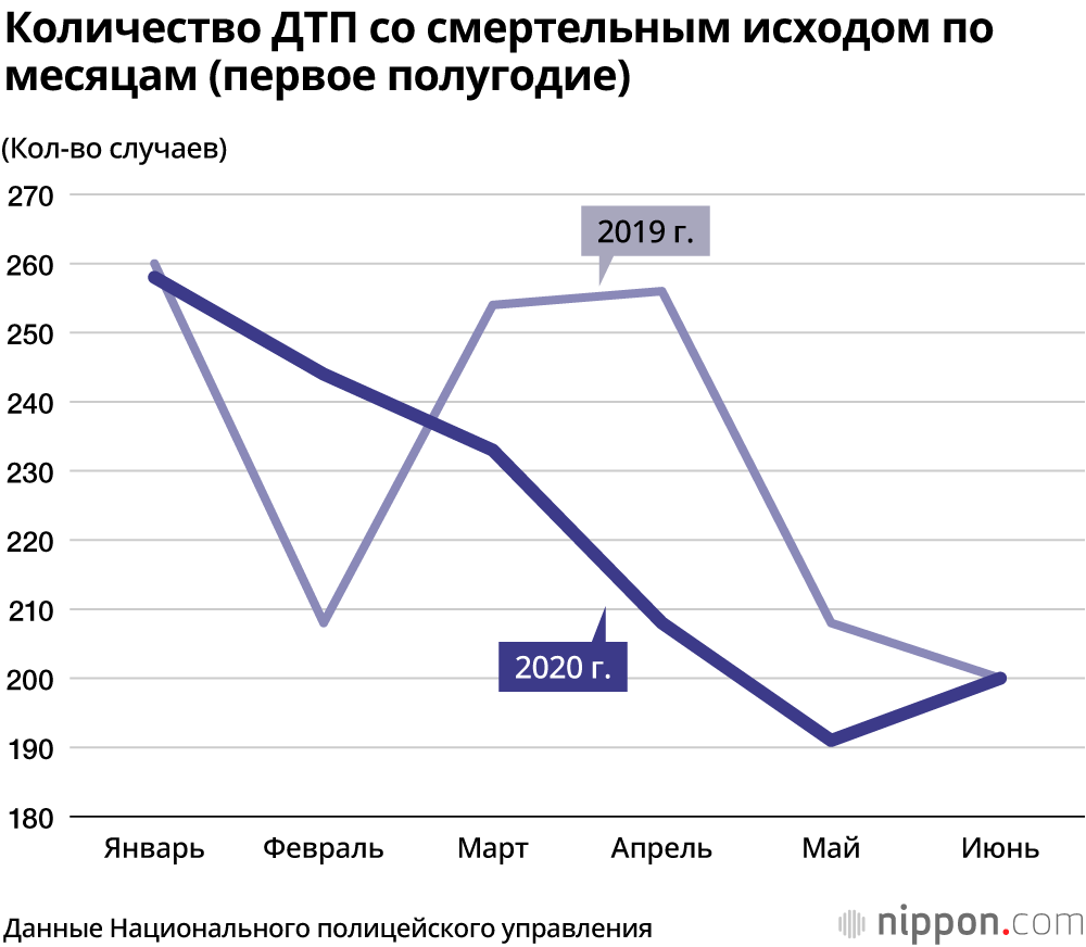 Согласно отчёту Национального полицейского управления, опубликованному 28 июля, количество дорожно-транспортных происшествий по всей стране с января по июнь 2020 года составило 145 487 (предварительная оценка). Это на 22,5% меньше, чем за аналогичный период прошлого года. Число пострадавших составило 173 600 человек (предварительная оценка), оно снизилось на 23,6%. Кроме того, произошло 1334 ДТП со смертельным исходом, погибло 1357 человек, что соответственно на 3,8% и 4,3% меньше по сравнению с первым полугодием 2019 года. Таким образом, в первой половине 2020 года, когда людей призывали к самоизоляции, особенно заметно снижение общего количества ДТП и травм.