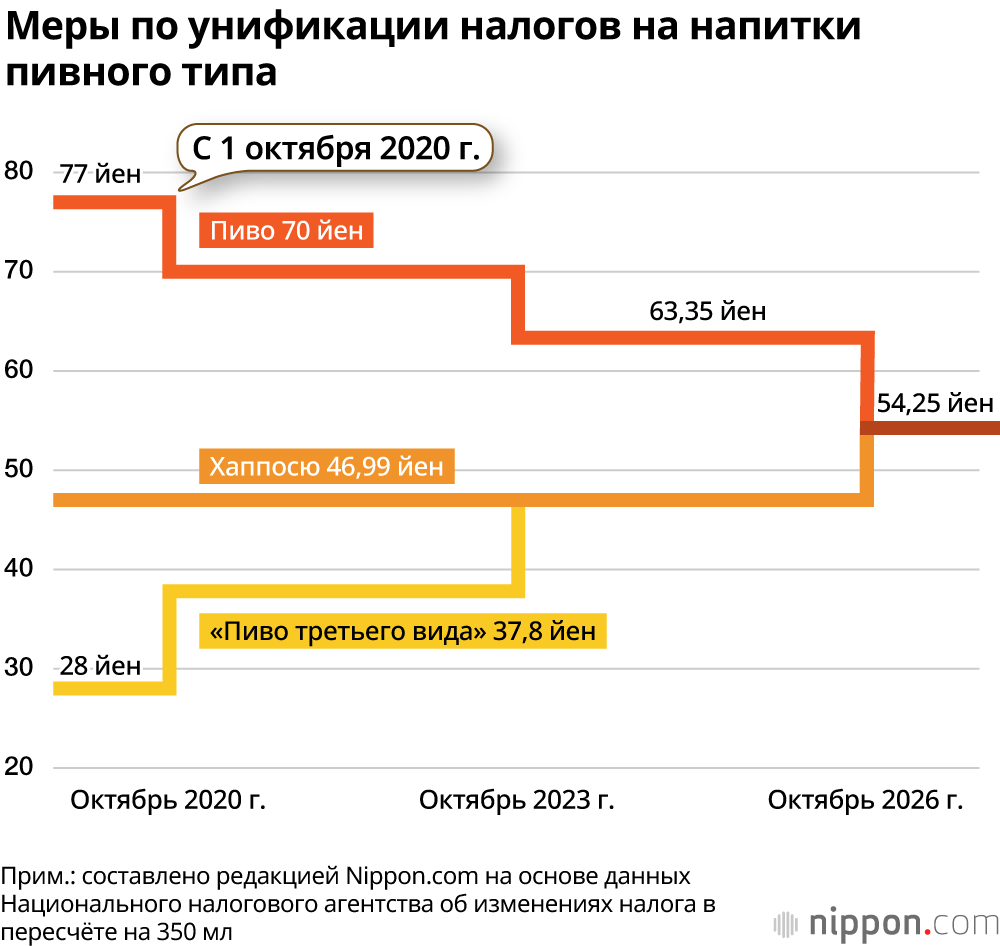 Повышение и понижение налогов на спиртные напитки в октябре 2020 года является первым из трёх этапов реформы налога на спиртные напитки, направленной на устранение разницы в ставках налога на алкогольные напитки. В октябре 2023 года налог на «пиво третьего вида» вырастет до уровня налога на хаппосю, а налог на пиво вновь будет снижен. В 2026 году уравняются ставки налога на пиво, хаппосю и «пиво третьего вида».