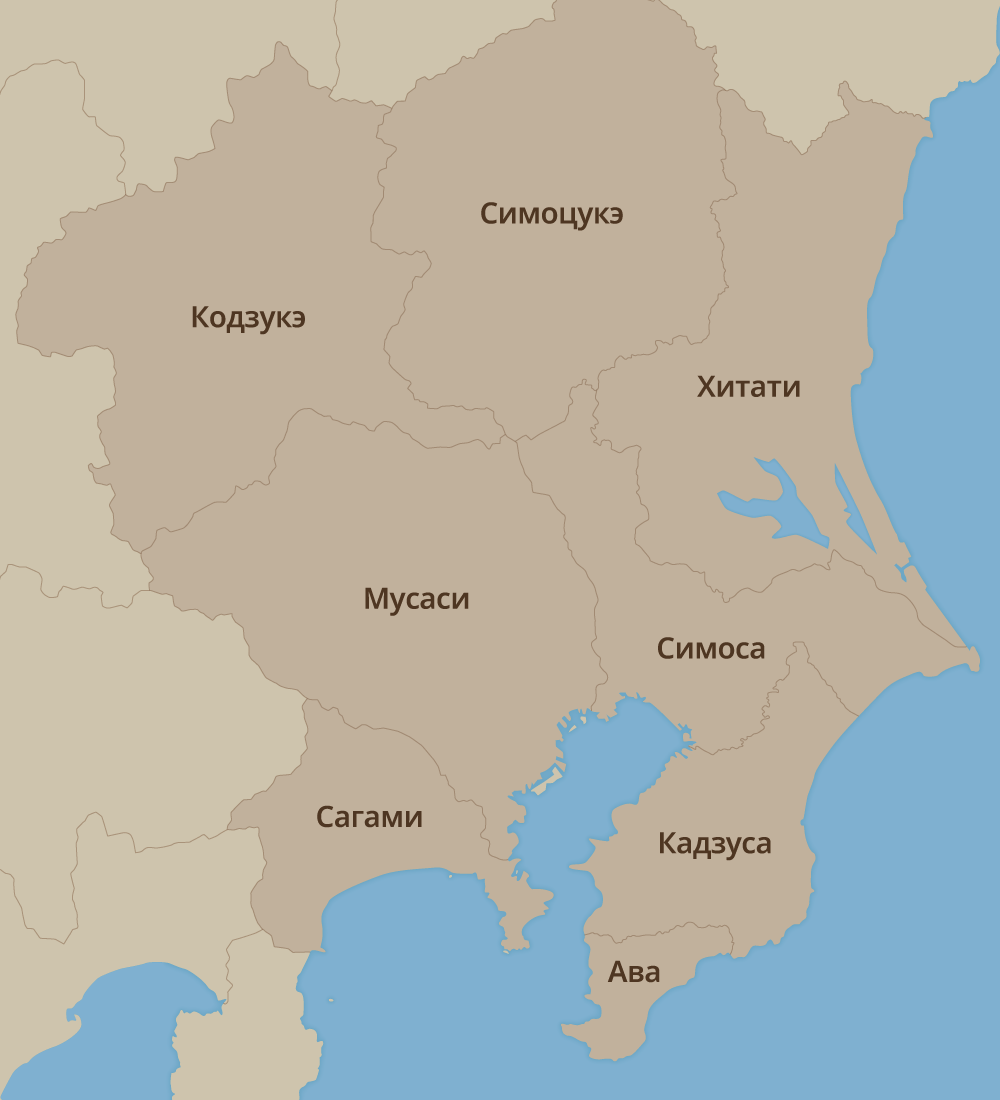Если посмотреть на карту, мы увидим, что земля Кадзуса (上総), в названии которой использован иероглиф «верх» (上), находится южнее, или «ниже» земли Симоса (下総) с иероглифом «низ» (下) – на самом деле названия были связаны не с расположением севернее или южнее, а с близостью к столице, то есть Киото – чем ближе, тем «выше». Раньше до полуострова Босо добирались морем из земли Сагами, поэтому южная часть полуострова, то есть земля Кадзуса, считалась находившейся ближе к столице.
