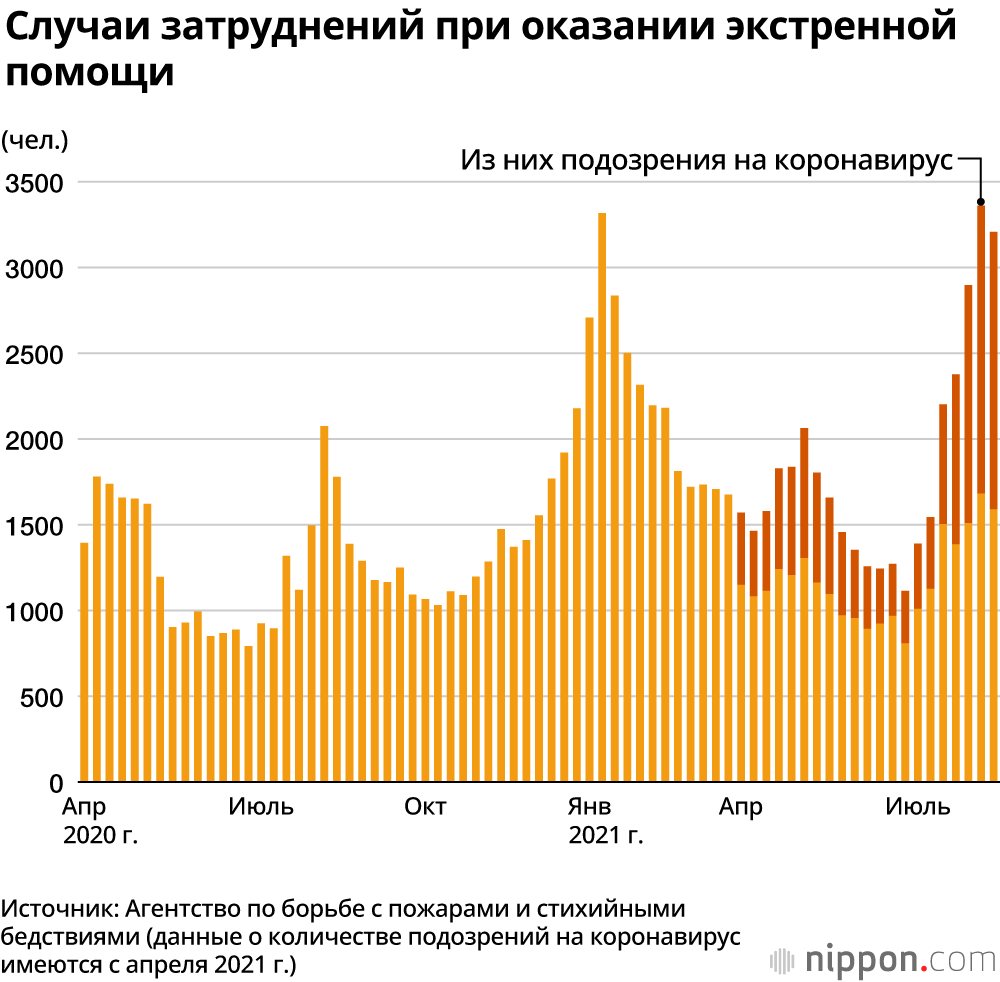 По данным Министерства внутренних дел и коммуникаций, за неделю с 16 по 22 августа было зарегистрировано 3207 случаев, когда служба скорой помощи не могла быстро найти больницу для пациентов, и в 1617 случаях это были пациенты с подозрением на COVID-19.