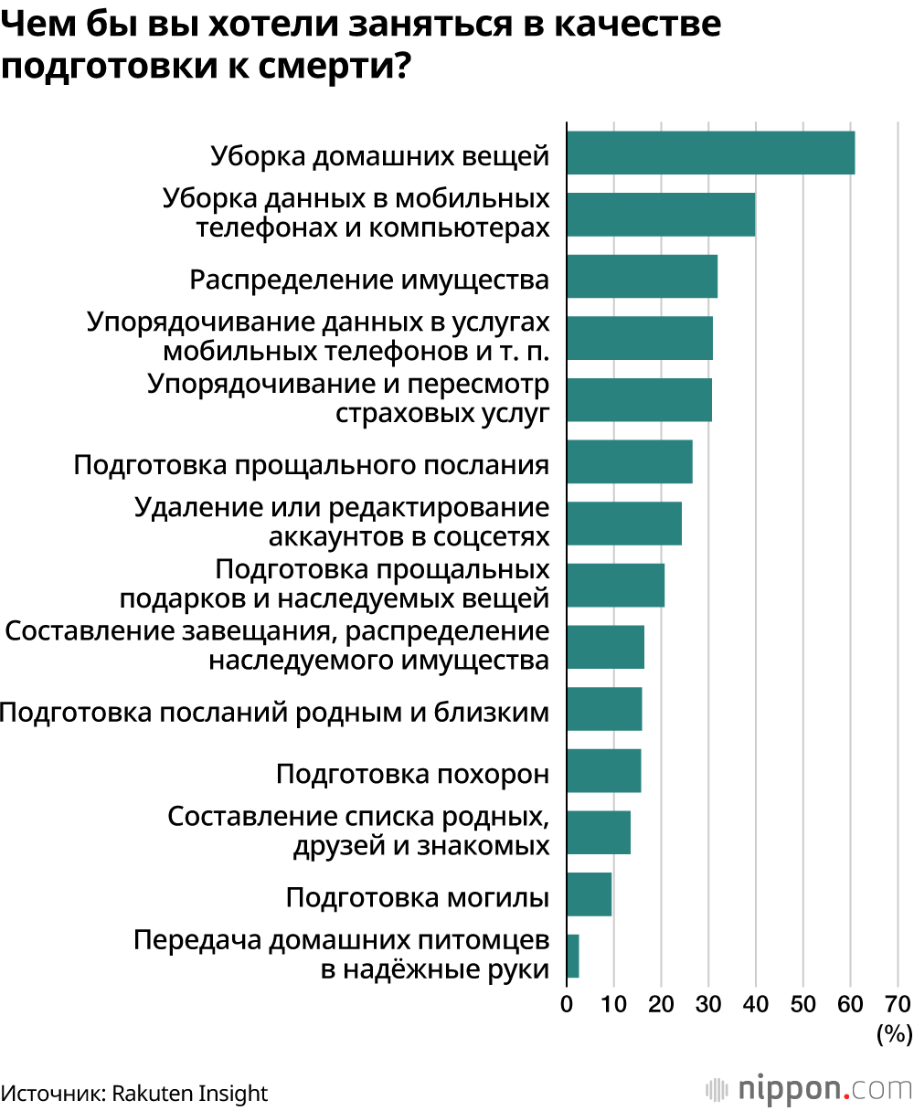 Что же конкретно включает такая деятельность? Чаще всего называют приведение в порядок домашних вещей (60,9%), далее следует упорядочивание данных на ПК и смартфонах (39,8%), этот пункт сейчас вызывает больше беспокойства, чем распоряжение имуществом (31,9%).