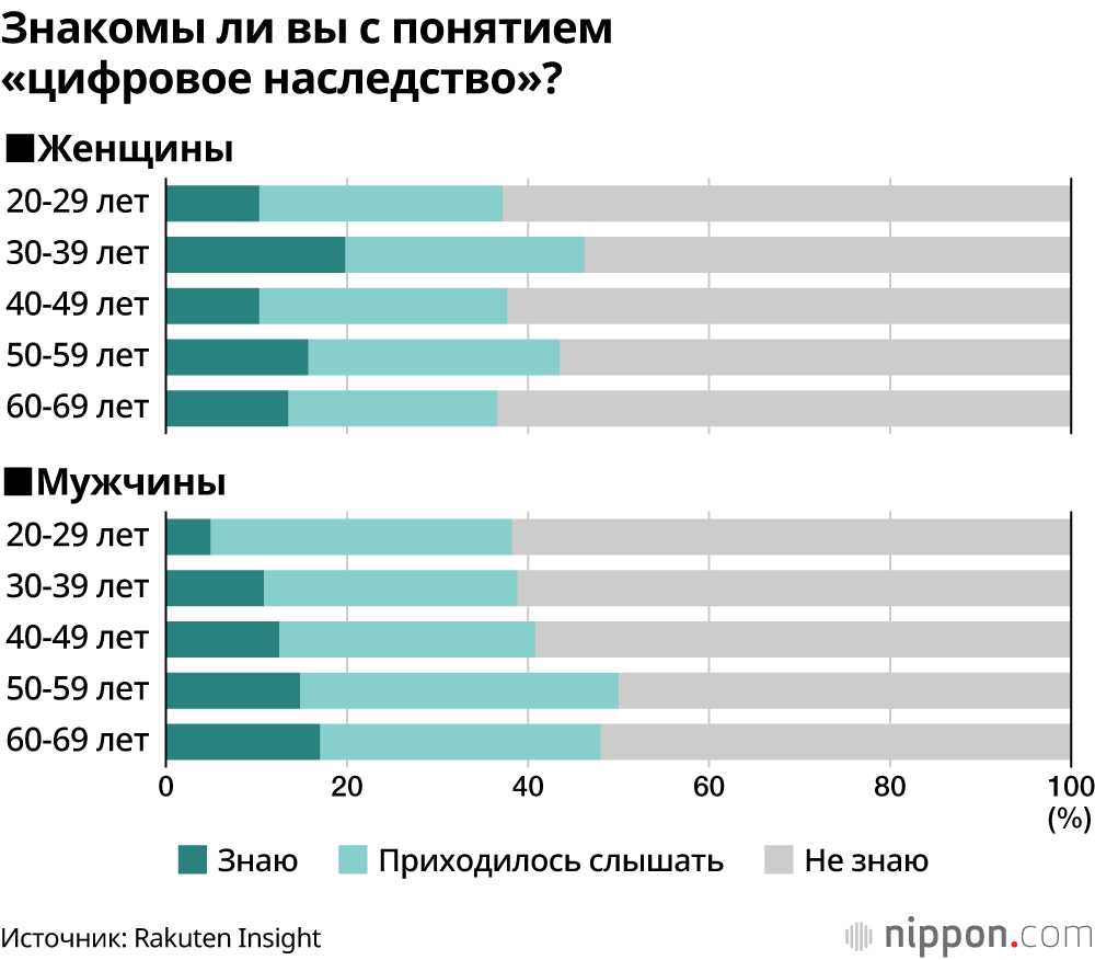 Термин «цифровое наследство», обозначающее накопленные при жизни данные, сохранённые на компьютерах и смартфонах, а также данные, хранящиеся в Интернете, такие как учётные записи SNS и онлайн-банков, знает 41,8% опрошенных. Особенно заметен рост осведомлённости у мужчин по мере приближения к возрасту, когда они чувствуют потребность задуматься о смерти.