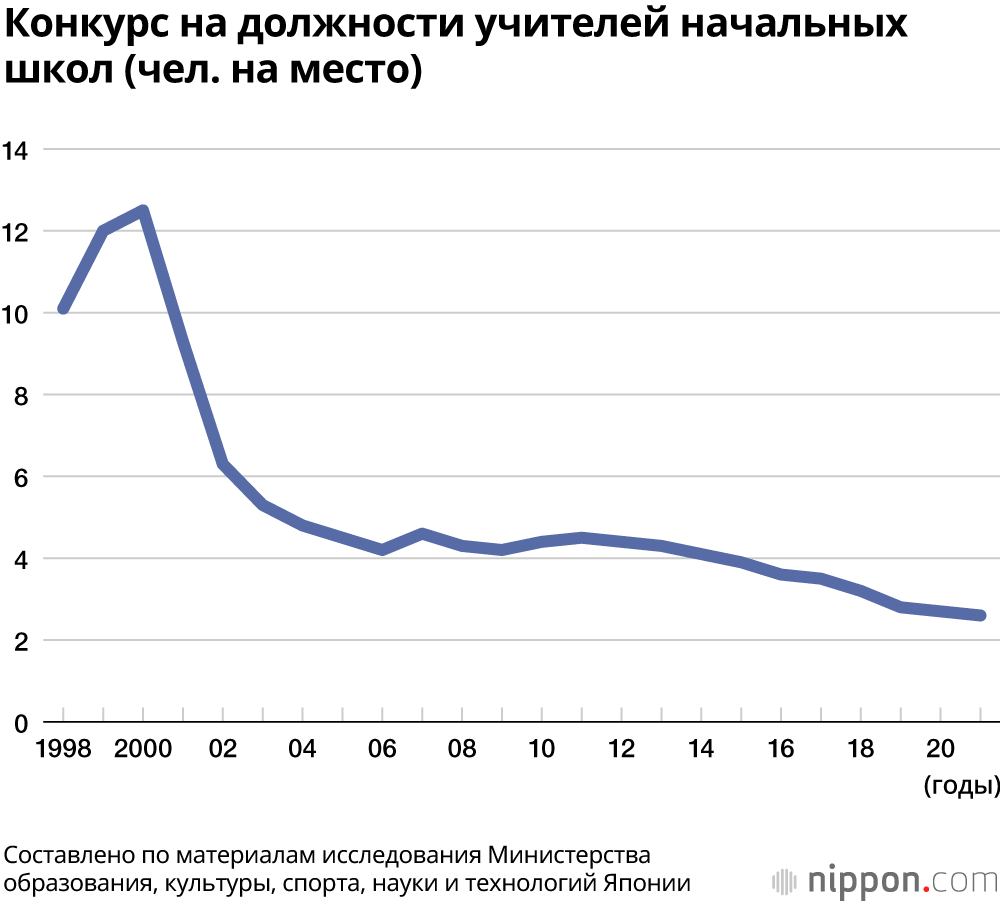 Согласно результатам теста по отбору учителей государственных школ на 2021 год, проводившегося в 2020 году Министерством образования, культуры, спорта, науки и технологий, конкурс среди учителей начальных школ достиг рекордно низкого показателя в 2,6 человека на место, что значительно ниже пикового показателя в 12,5 человека на место в 2000 году. Среди претендующих на должность учителей средних школ этот показатель составил 4,4, в старших – 6,6, в школах для детей с особыми потребностями – 3,1, что составляет около 30-60% от пика 2000-х годов.