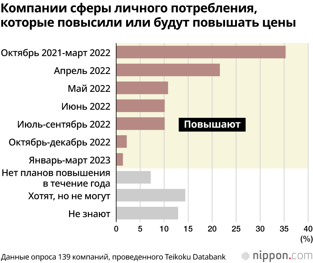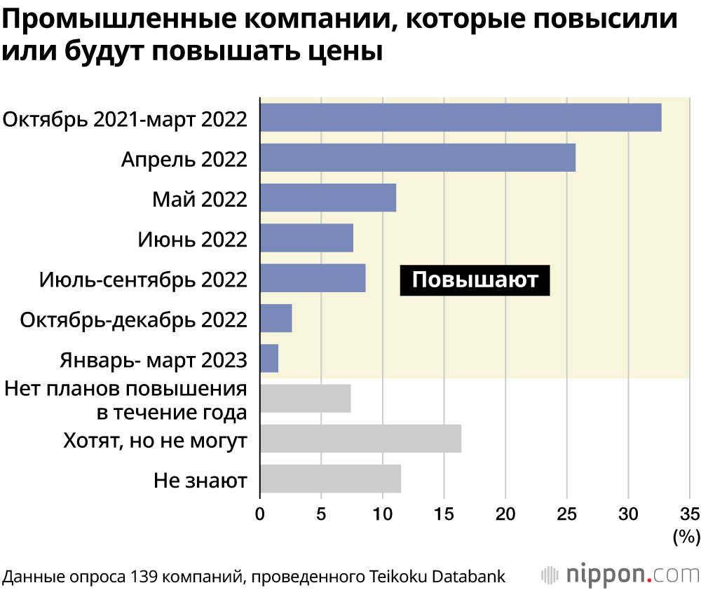 Согласно опросу аналитического центра Teikoku Databank, проведенному среди компаний по всей стране с 1 по 5 апреля, более 30% компаний провели повышение цен в период с октября 2021 года по март 2022 года. Кроме того, 43,2% компаний намерены повышать цены в течение года после апреля 2022 года, в том числе 25,7% в апреле и 11,1% в мае.