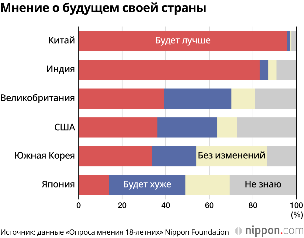 Согласно «Опросу мнения 18-летних», проведенному Nippon Foundation среди 6000 молодых людей в шести странах мира, доля тех, кто считал, что в будущем их страна станет лучше, оказалась в Японии самой низкой, 13,9%, и наибольший процент ответивших, что страна станет хуже, тоже оказался в Японии, составив 35,1%.