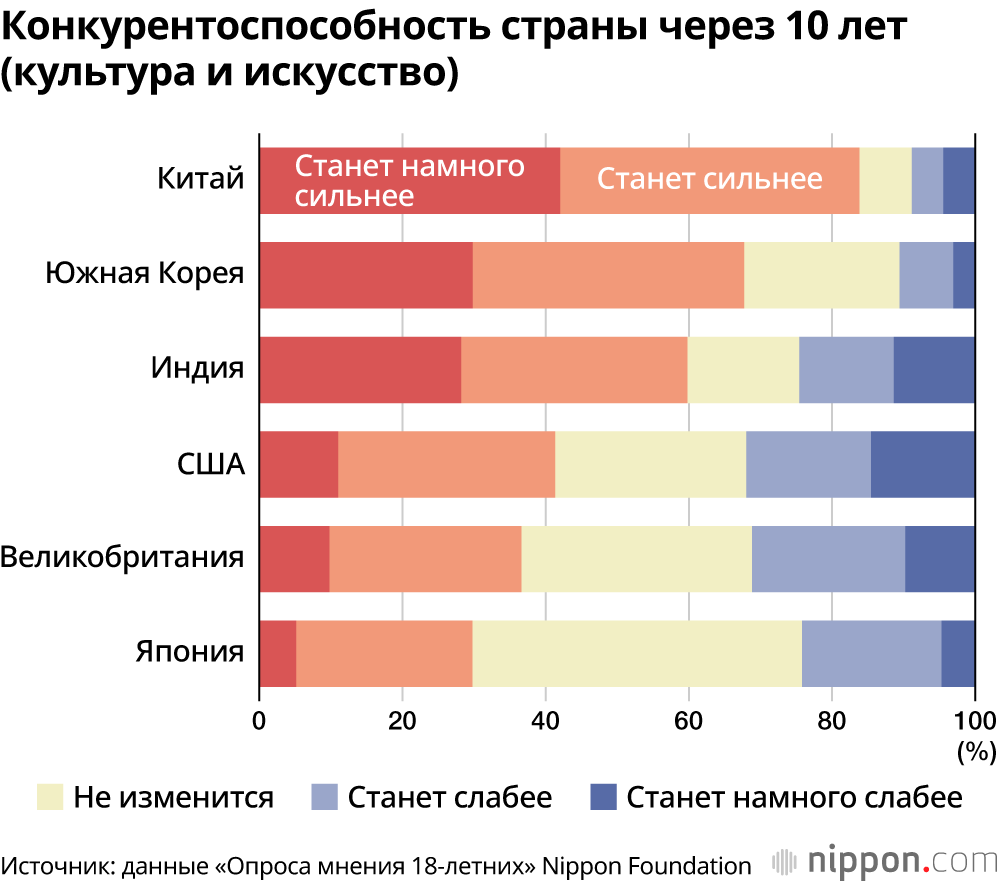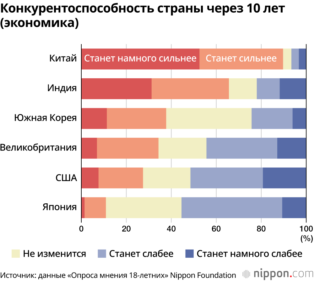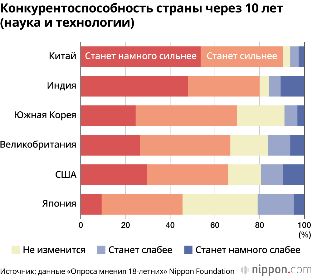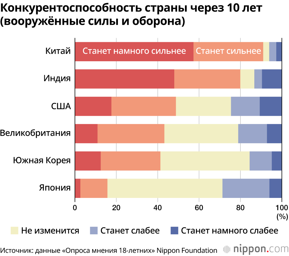 На вопрос о конкурентоспособности своей страны через 10 лет в четырёх областях – «экономика», «наука и технологии», «вооружённые силы и оборона» и «культура и развлечения», в Японии положительные ответы типа «станет намного сильнее» и «станет сильнее» дало наименьшее количество респондентов.