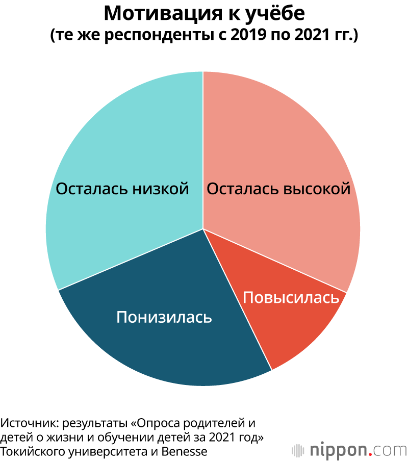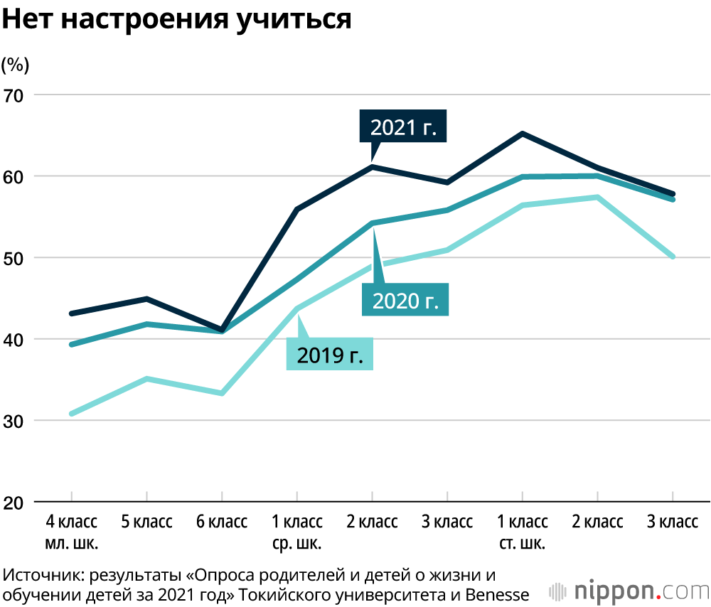 В ходе «Опроса родителей и детей о жизни и обучении детей за 2021 год», опубликованного Институтом социальных наук Токийского университета и Институтом образования Benesse, был задан вопрос о том, в какой степени соответствует ощущениям респондента утверждение «У меня не возникает желания учиться». В опросе участвовали учащиеся от 4 года начальной школы до3 класса школы старшей ступени, и количество ответов «Соответствует» и «В общем соответствует» выросло на 9,2% по сравнению с опросом 2019 года, достигнув уровня в 54,3%.