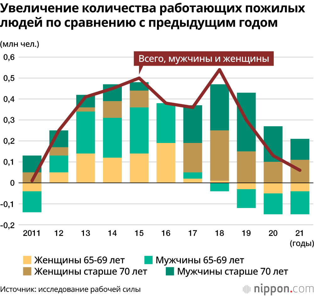 По данным Министерства внутренних дел и коммуникаций, количество трудоустроенных людей в возрасте 65 лет и старше в 2021 году достигнет 9,09 млн человек, превышая показатель предыдущего года 18-й год подряд. Уровень занятости среди людей в возрасте 65 лет и старше составил 25,1%. Среди людей от 65 до 69 лет работает 50,3% – этот показатель впервые превысил 50%.