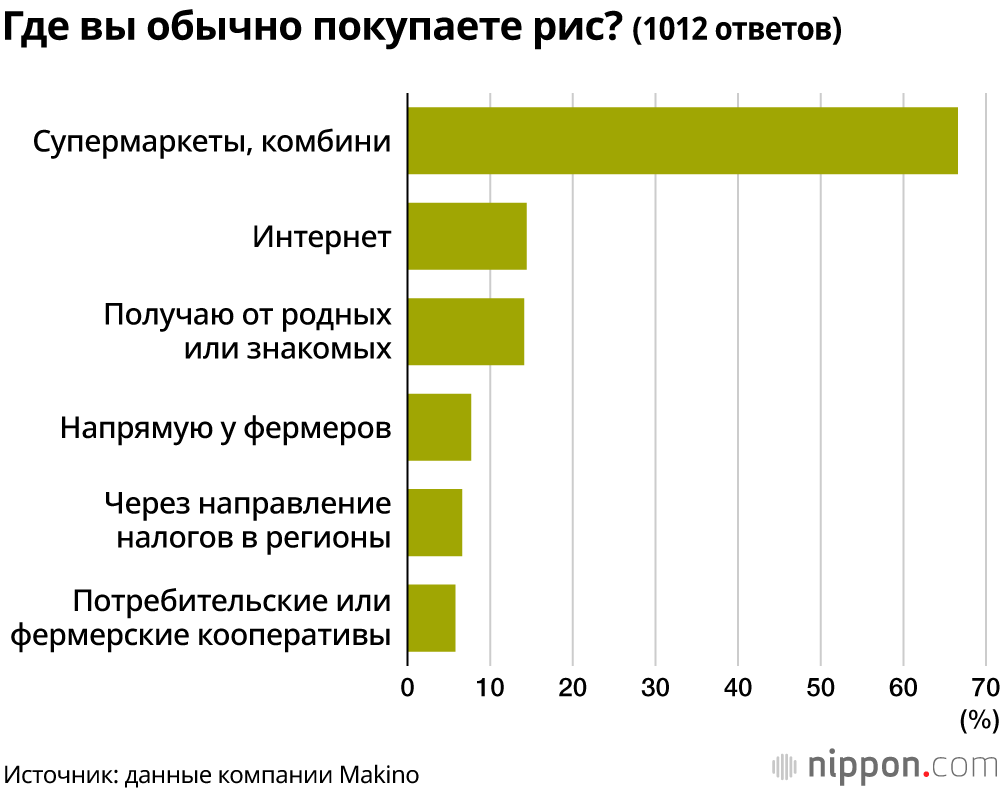 66,6% респондентов покупали рис в розничных магазинах, таких как супермаркеты и магазины шаговой доступности (комбини), 14,1% – через Интернет, и 14,1% – у знакомых и родственников. Некоторые люди покупают рис в качестве ответных подарков за то, что направляют налоги в регионы. Обычные в эпоху Сёва (1926-1989) «рисовые лавки» в городах уже исчезли и больше не являются одним из привычных мест, где покупают рис.