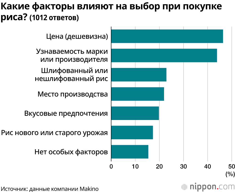 Наиболее распространёнными факторами выбора риса были цена, то есть дешевизна (46,4%), узнаваемость торговой марки или имени производителя (43,9%), тогда как вкусовые предпочтения влияют на выбор лишь 19,8% потребителей.