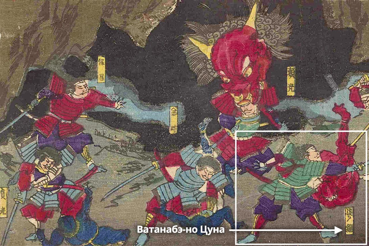 Минамото-но Ёримицу и воины, сражающиеся с подчиненными Сютэн-додзи на горе Оэ. Среди них был и Ватанабэ-но Цуна. «Минамото-но Ёримицу истребляет демонов на горе Ооэяма» (Минамото-но ёримицу ооэяма они тайдзи, специальная коллекция Токийской столичной центральной библиотеки)