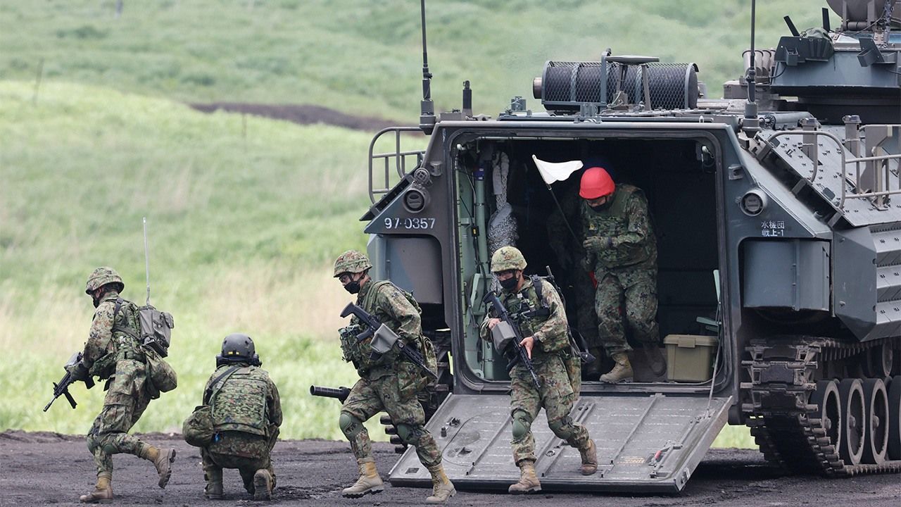 Фотография к заголовку: Члены десантной бригады быстрого развёртывания высаживаются из десантного автомобиля AAV7 во время общих учений с огневой мощью на полигоне Хигаси-Фудзи в префектуре Сидзуока, 28 мая 2022 г. (© Jiji)