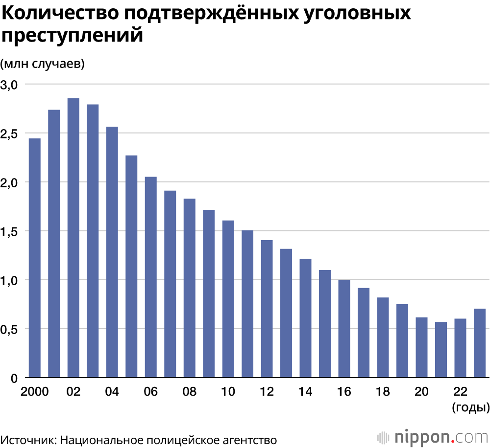 Число признанных уголовных преступлений достигло пика в 2,85 миллиона в 2002 году и с тех пор снижалось, но в 2022 году оно начало расти впервые за 30 лет. В 2023 году оно было ещё на 6% ниже, чем в 2019 году, до пандемии. Количество «уличных преступлений» (грабежи, кражи, кражи велосипедов, нападения, нанесение телесных повреждений, вымогательства и др.) увеличилось на 21% по сравнению с предыдущим годом, и Национальное полицейское агентство видит причину в оживлении деятельности после того, как новый коронавирус был переведен из второй в пятую категорию уровня опасности в национальной классификации инфекционных заболеваний.