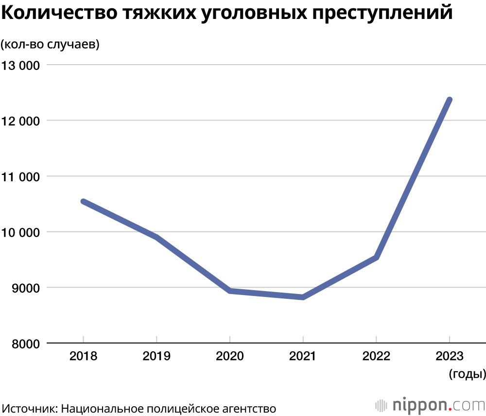 Было зарегистрировано 12 372 случаев тяжких преступлений, таких как убийства, грабежи, поджоги, принуждение к половому акту, непристойные посягательства, похищение людей и торговля людьми, что на 29,8% больше, чем в предыдущем году. Количество убийств немного увеличилось, с 853 до 912, а грабежей – с 1148 до 1361. С другой стороны, число случаев принуждения к половому акту (2711 случаев) и непристойных посягательств (6096 случаев) выросло более чем на 1000 по сравнению с предыдущим годом. В июле 2023 года положения Уголовного кодекса были пересмотрены, в том числе пересмотрены критерии принуждения к сексу и теперь включают секс без согласия, а Национальное полицейское агентство заявило: «Важно создать среду, в которой можно легко сообщать и обращаться за советом относительно сексуальных преступлений, что уменьшит количество зарегистрированных случаев». Эти изменения могли привести к увеличению числа таких преступлений.