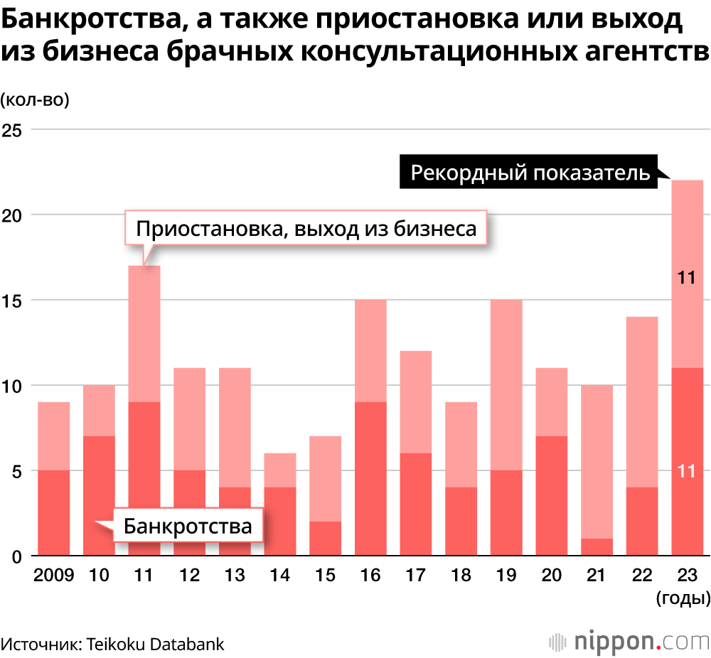 Аналитическая компания Teikoku Databank сообщила, что в 2023 году обанкротилось 11 брачных агентств, которые знакомили партнёров для брака, и это самый высокий показатель за всю историю. Ещё в 11 случаях компании объявили о приостановке или ликвидации бизнеса, что также стало рекордным показателем.