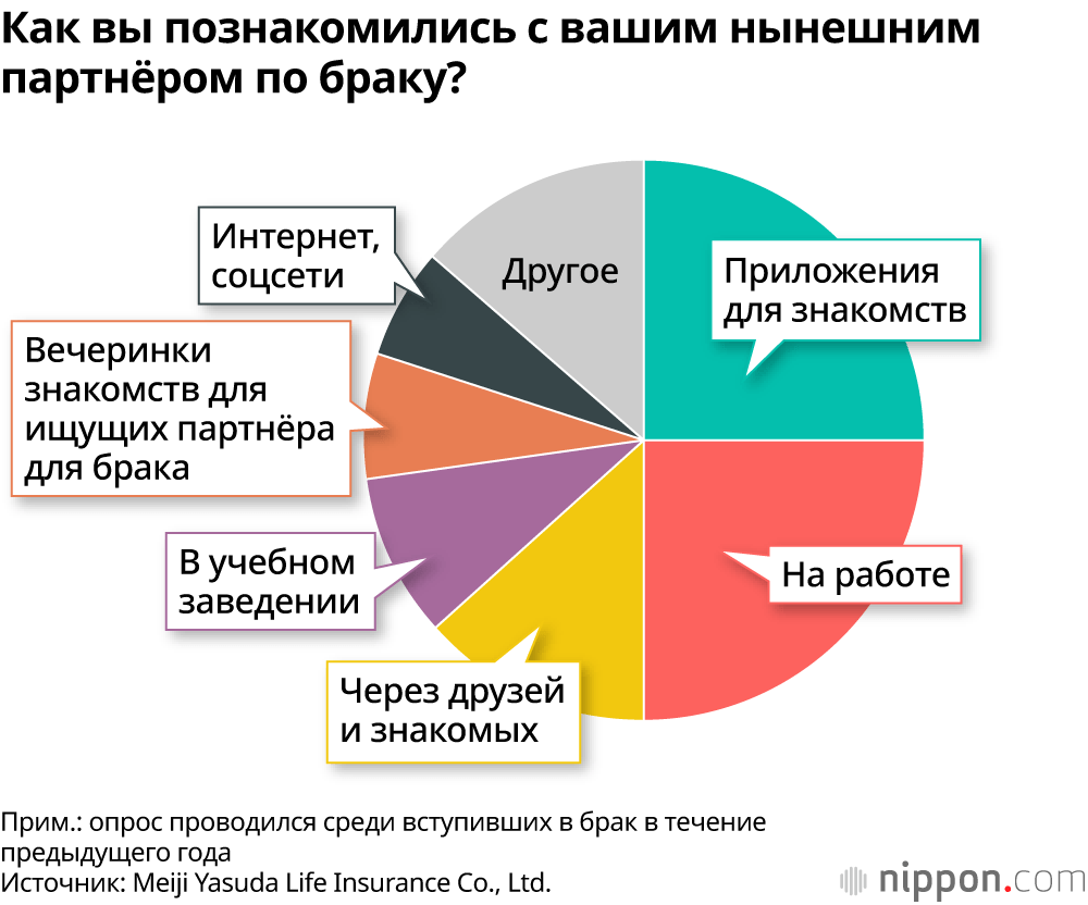 Интернет-опрос, который провела страховая компания Meiji Yasuda Life Insurance Co., Ltd. в октябре 2023 года, показал, что среди пар, поженившихся в течение года до опроса, каждая четвёртая использовала приложение для поиска партнёра (25%). На вопрос о том, что послужило причиной использования таких приложений, 46,7% респондентов отвечали, что там легче знакомиться, называли также невозможность знакомиться на работе и широкий выбор для поиска человека, который может понравиться, при знакомствах онлайн. Таким образом, люди всё чаще используют приложения из-за того, что они упрощают поиск.