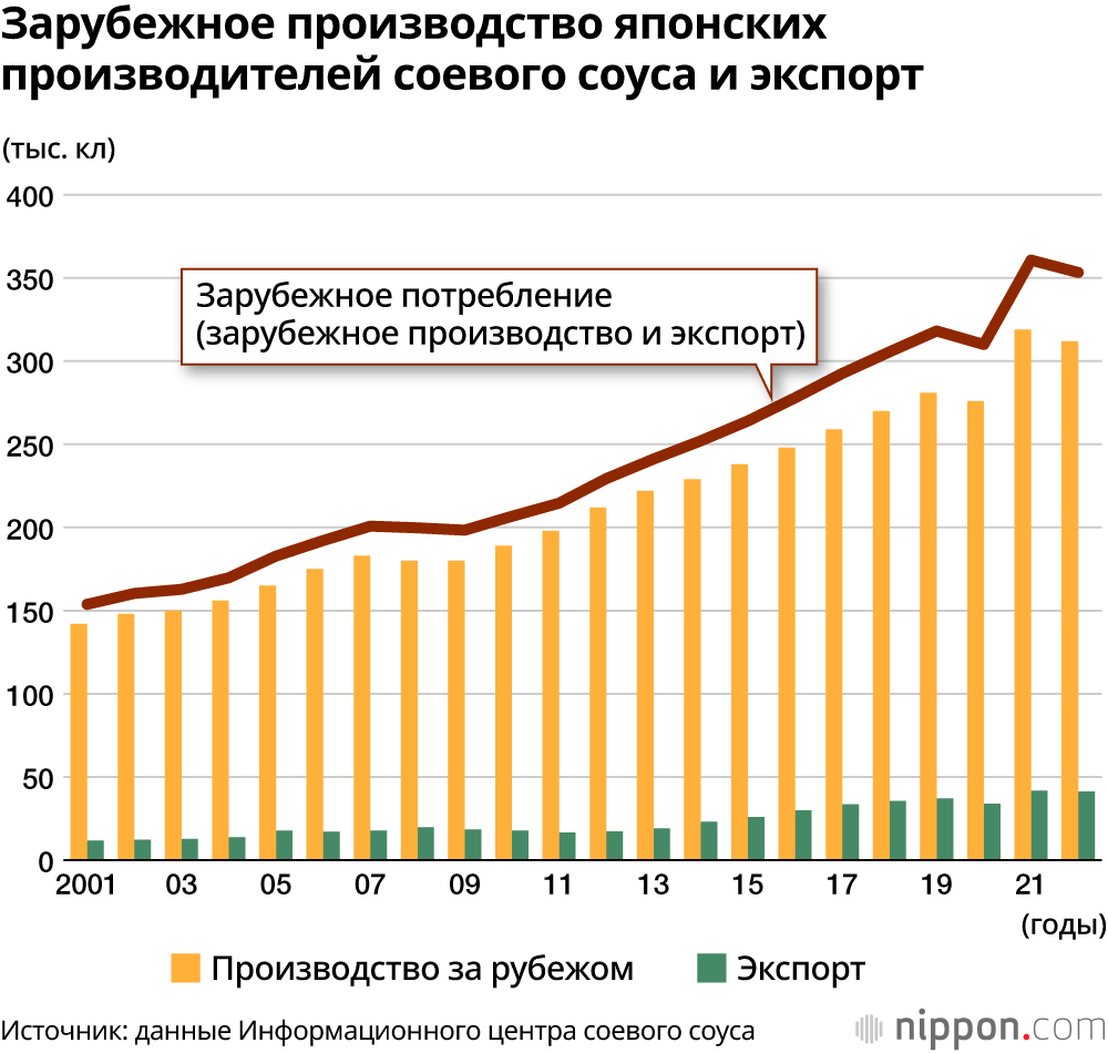 По данным Информационного центра соевого соуса (Токио), организации по распространению информации, созданной Японской ассоциацией производителей соевого соуса и другими участниками, объём производства японских производителей соевого соуса на зарубежных заводах в 2022 году составил 312 000 килолитров. Объём экспорта составляет примерно 41 000 килолитров, а совокупное потребление за рубежом японского соевого соуса – 353 000 килолитров. Это в 1,1 раза больше грузоподъемности типичного большого нефтяного танкера (VLCC).