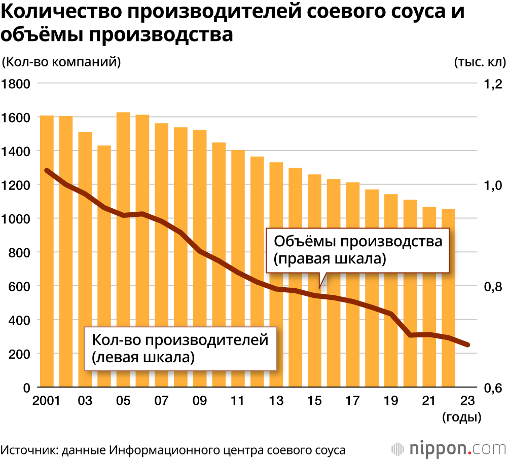 При этом годовой объём внутренних продаж соевого соуса (включая экспорт) в 2023 году составил 683 340 килолитров. Продажи достигли пика в 1,25 миллиона килолитров в 1979 году и за последние 20 лет снизились примерно на 30%.