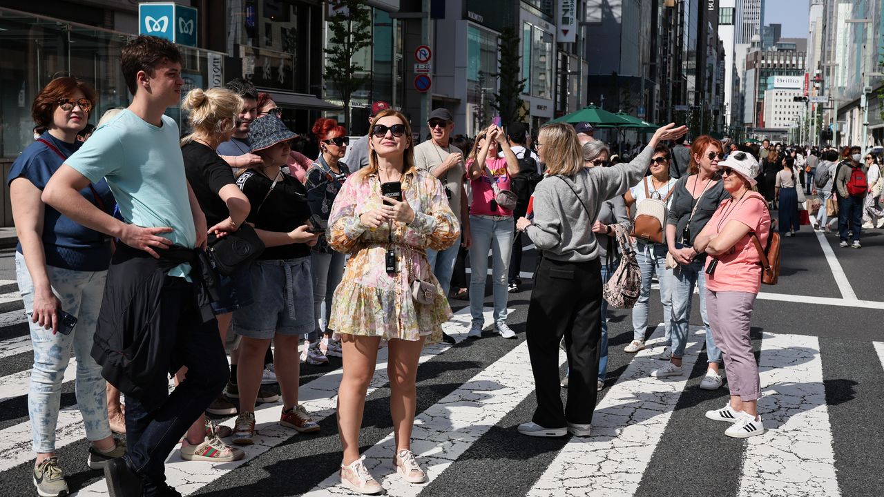 Фотография к заголовку: Множество иностранных туристов на Гиндзе в Токио, 14 апреля 2024 г. (Jiji Press)