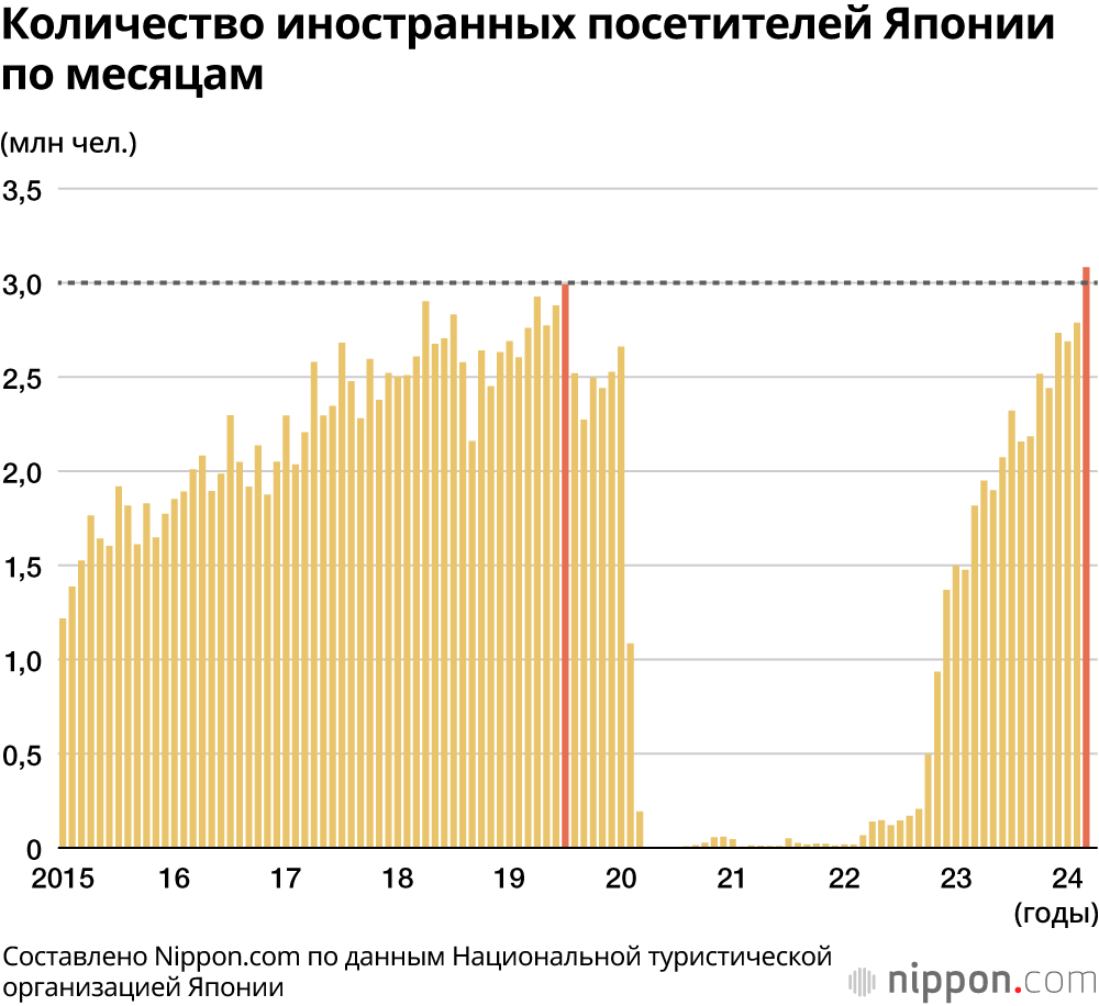 Оценочное количество иностранных гостей Японии в марте 2024 года, по данным Национальной туристической организацией Японии, составило 3 081 600, что на 69,5% больше, чем за тот же месяц прошлого года. Ранее рекордный уровень посетителей наблюдался в июле 2019 года, тогда за месяц приехало 2 991 189 человек, и сейчас этот показатель впервые превысил отметку в 3 миллиона человек за месяц.