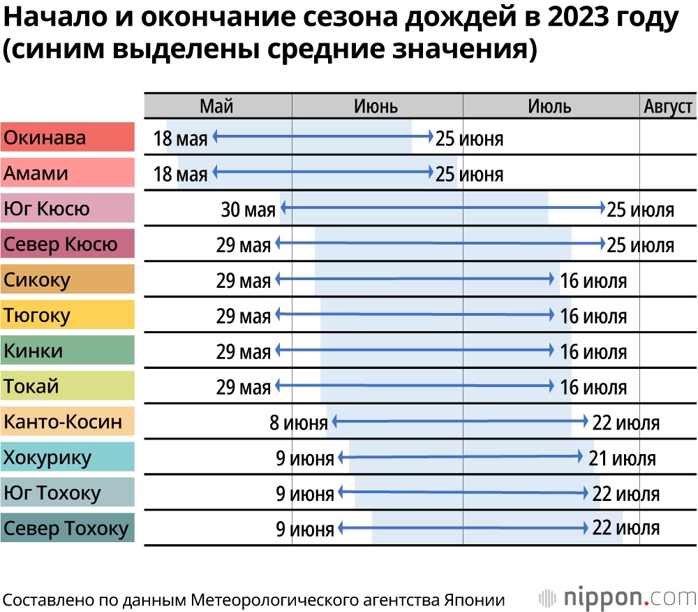 В разных регионах Японии начало и окончание сезона дождей приходятся на разные даты, и количество осадков может также сильно различаться. На диаграмме ниже показаны сроки начала и окончания сезона дождей в каждом регионе в 2023 году и среднегодовые значения. В прошлом году сезон дождей начался на севере Кюсю, в регионах Сикоку, Тюгоку, Кинки и Токай одновременно – 29 мая, примерно на неделю раньше обычного. В регионах Токай и Кинки сезон дождей начался в мае впервые за 10 лет.