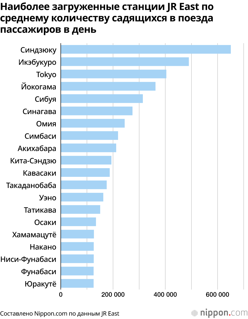 Данные JR East за 2023 финансовый год показывают, что на станции Синдзюку ежедневно садилось на поезда больше всего пассажиров – 650 602 (рост на 8,0% в годовом исчислении), за ней следуют Икэбукуро (489 933, рост на 6,8%) и Токио (403 831, рост на 16,5%). Другими самыми загруженными станциями в порядке убывания были Ёокогама, Сибуя, Синагава, Омия, Симбаси, Акихабара и Кита-Сэндзю. Первая десятка и порядок станций в рейтинге не поменялись с 2022 финансового года. Эти цифры показывают только пассажиров, которые садились в поезда, и не включают тех, кто выходит из поезда.