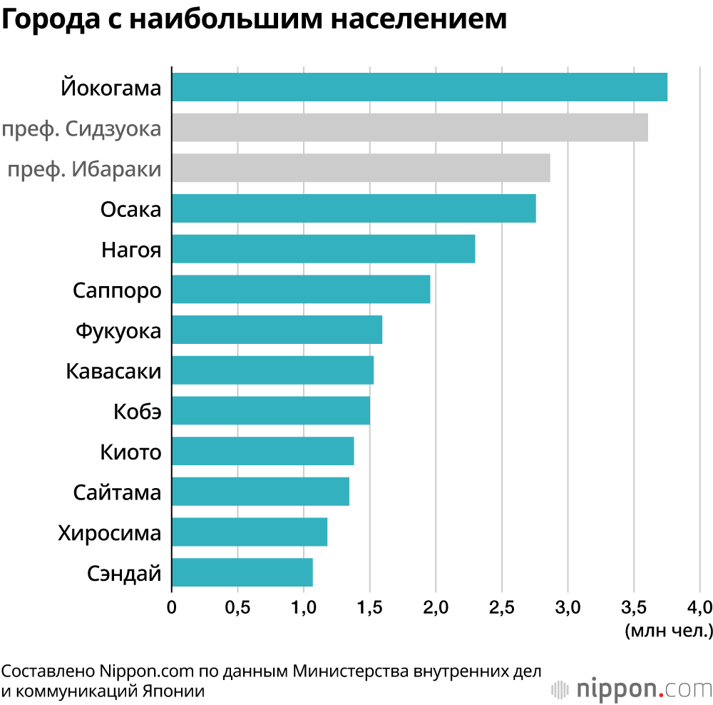 Согласно основанному на данных регистрации жителей демографическому исследованию, опубликованному Министерством внутренних дел и коммуникаций, три города с самой большой численностью населения в Японии по состоянию на 1 января 2024 года – это Йокогама (3 752 969), Осака (2 757 642) и Нагоя (2 297 745). При этом следует отметить, что Токио как административная единица считается особым видом префектуры, а не городом. Население Йокогамы превышало общее население всей префектуры Сидзуока (3 606 469), а город Осака имел почти такое же население, как префектура Ибараки (2 865 690). Всего в Японии насчитывается 11 городов с населением более 1 миллиона человек.