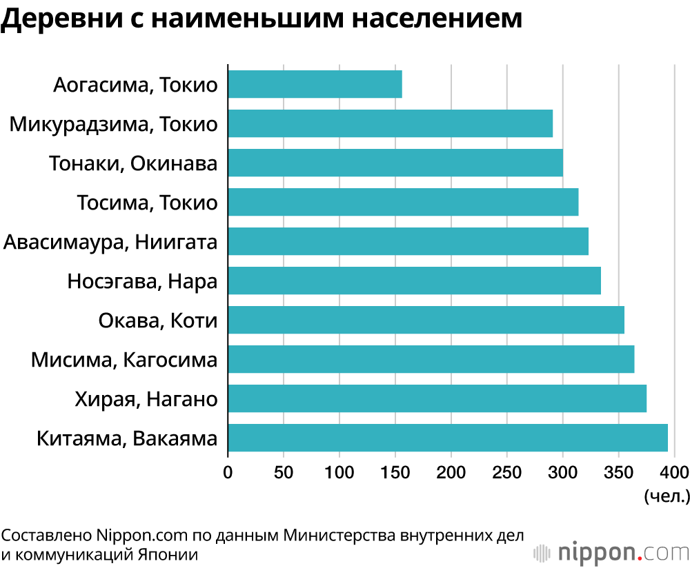 Есть также 12 деревень с населением менее 500 человек. В деревне Аогасима, которая входит в префектуру Токио, было меньше всего жителей – 156, за ней следовали Микурадзима, тоже в преф. Токио, с 291 жителем, и Тонаки в преф. Окинава с 300 жителями. Аогасима и Микурадзима расположены на островах Идзу, но находятся под управлением Токио, из-за чего сложилась необычная ситуация, когда наименее населённые деревни Японии находятся в административном подчинении одного из самых густонаселённых мегаполисов мира.