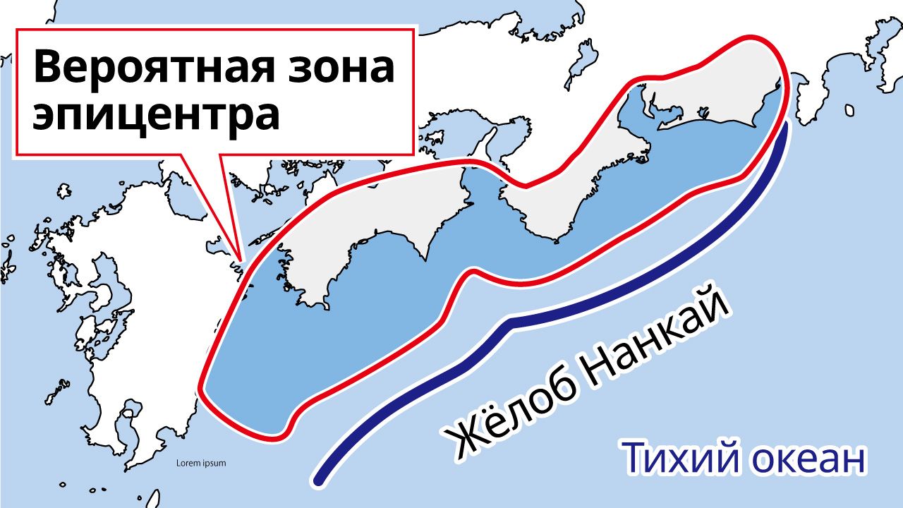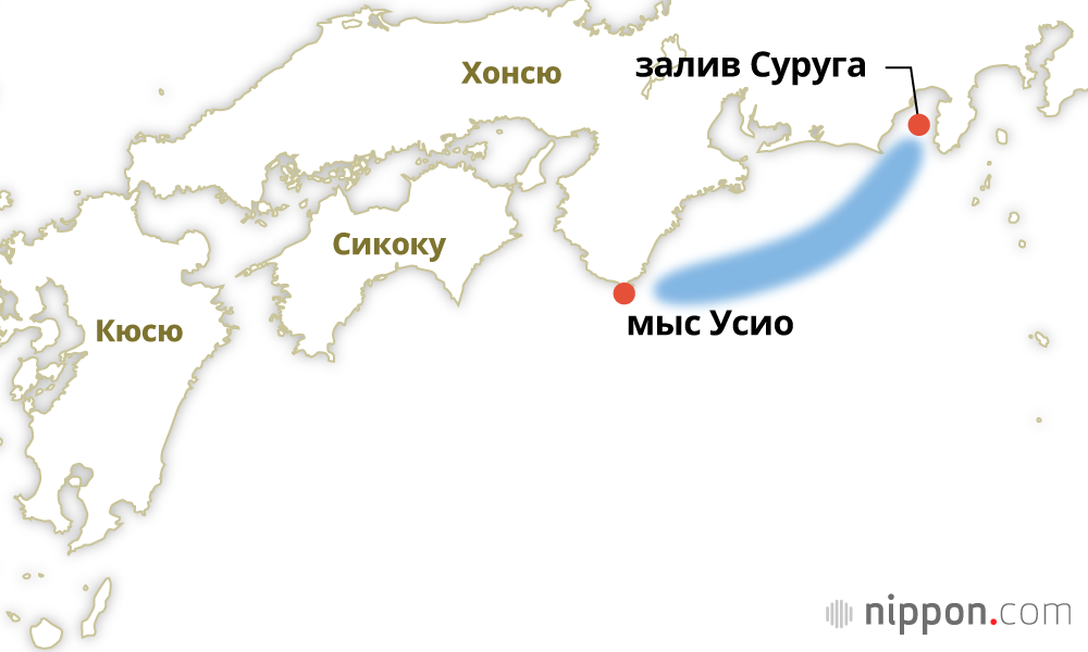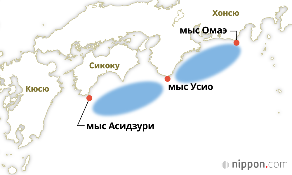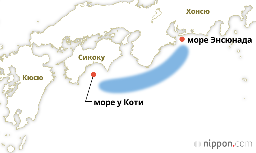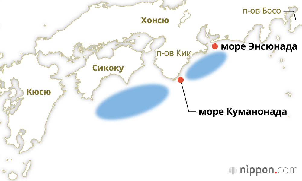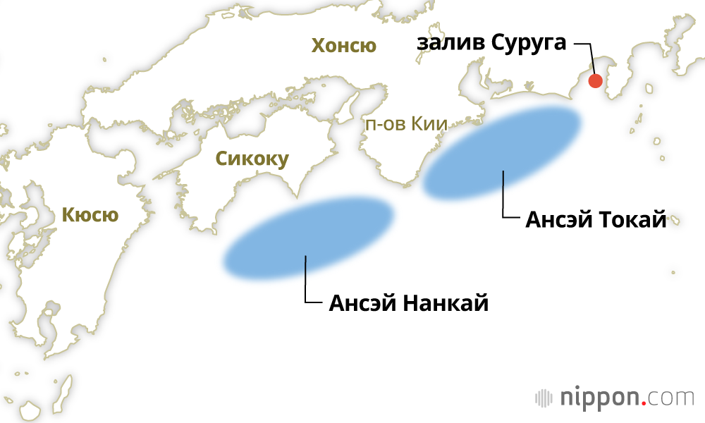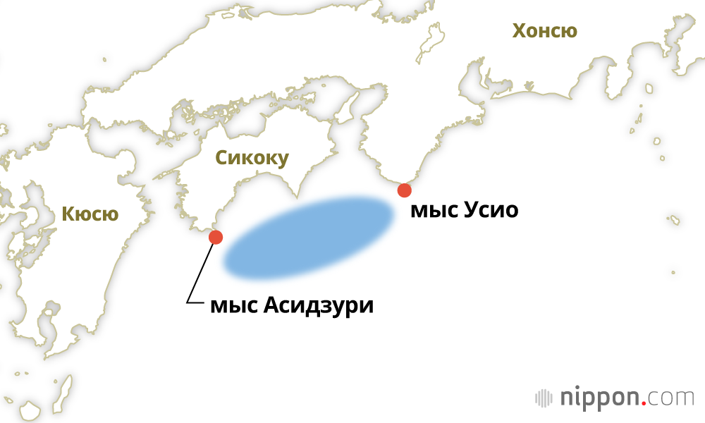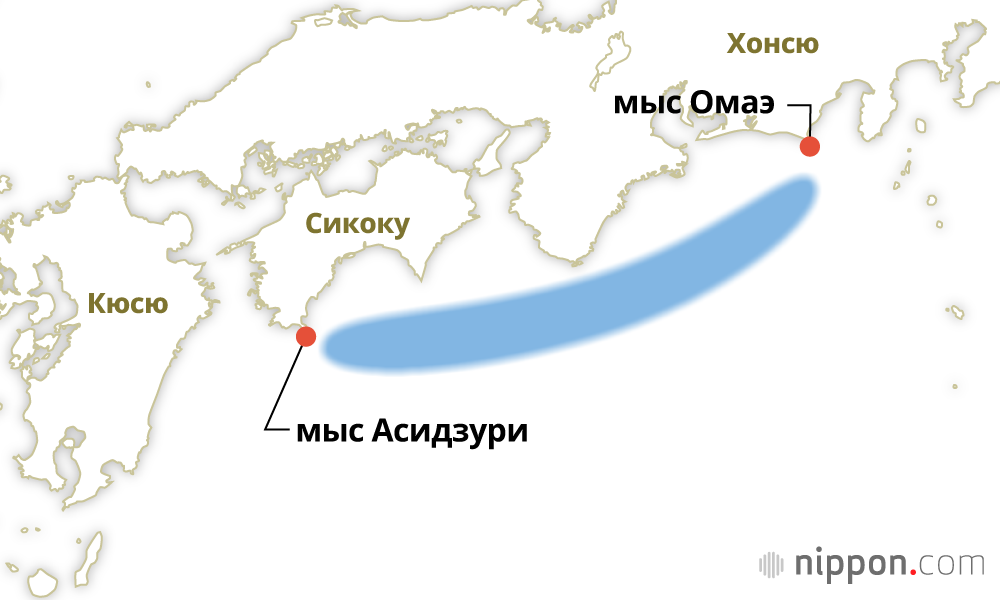 Фотография к заголовку: Нанкайский жёлоб и предполагаемая зона эпицентра (Кёдо цусин, отредактировано Nippon.com)