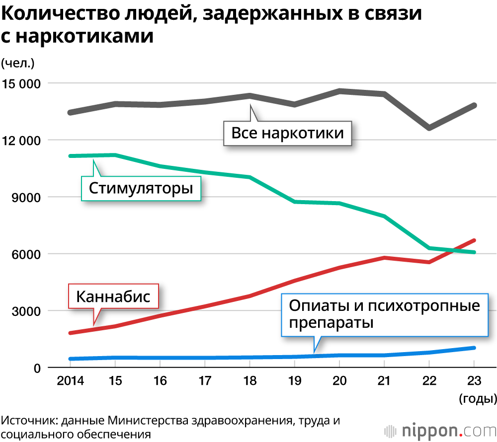 Общее количество арестованных по делам о наркотиках в 2023 году полицией, Бюро по контролю над наркотиками Министерства здравоохранения, труда и социального обеспечения и другими организациями, составило 13 815, что на 9,46% больше, чем в предыдущем году. Из них количество преступлений, связанных со стимуляторами, снизилось на 3,43% до 6073, оно падает восьмой год подряд. С другой стороны, число людей, арестованных за преступления, связанные с марихуаной, увеличилось на 20,9% до 6703, установив новый рекорд, и впервые превысило количество арестов за преступления, связанные со стимуляторами. Число людей, арестованных за преступления, связанные с наркотиками и психотропными веществами, увеличилось на 31,9% до 1033, что является самым высоким показателем за последние 10 лет.