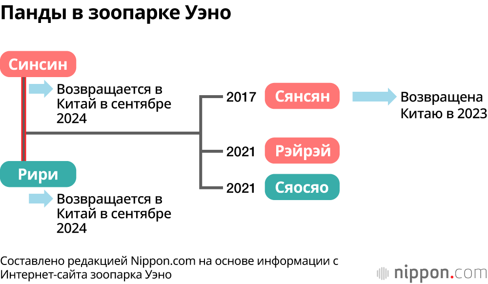Синсин и Рири родились в Китае в 2005 году. В 2011 году их предоставили в аренду Японии. По условиям соглашения, заключённого с Ассоциацией защиты диких животных Китая, обе панды должны были находиться в Японии до 20 февраля 2026 года, однако с возрастом животные стали болеть, поэтому было решено вернуть панд досрочно, чтобы обеспечить им прохождение лечения на родине.
