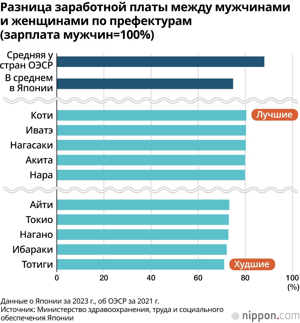 Согласно результатам, наибольшее неравенство (71,0%) наблюдалось в префектуре Тотиги было, а наименьшее – в префектуре Коти (80,4%), разница между ними составила почти 10 пунктов. Токио занимает четвёртое снизу место с показателем 73,0%, а общенациональный показатель составляет 74,8%. Средний показатель для развитых стран Организации экономического сотрудничества и развития (ОЭСР) – 88,1% (2021 г.). Таким образом, в Японии всё ещё велик разрыв в заработной плате между мужчинами и женщинами.