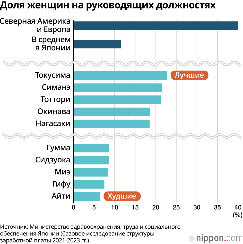 Доля женщин среди персонала на руководящих должностях в западных странах составляет около 40%, тогда как в Японии этот показатель значительно ниже – 11,6%. Худшее место по префектурам заняла префектура Айти с показателем 6,4%. За ней идут Гифу, Миэ, Сидзуока, то есть административные единицы в регионе Токай, в частности вокруг Нагоя.