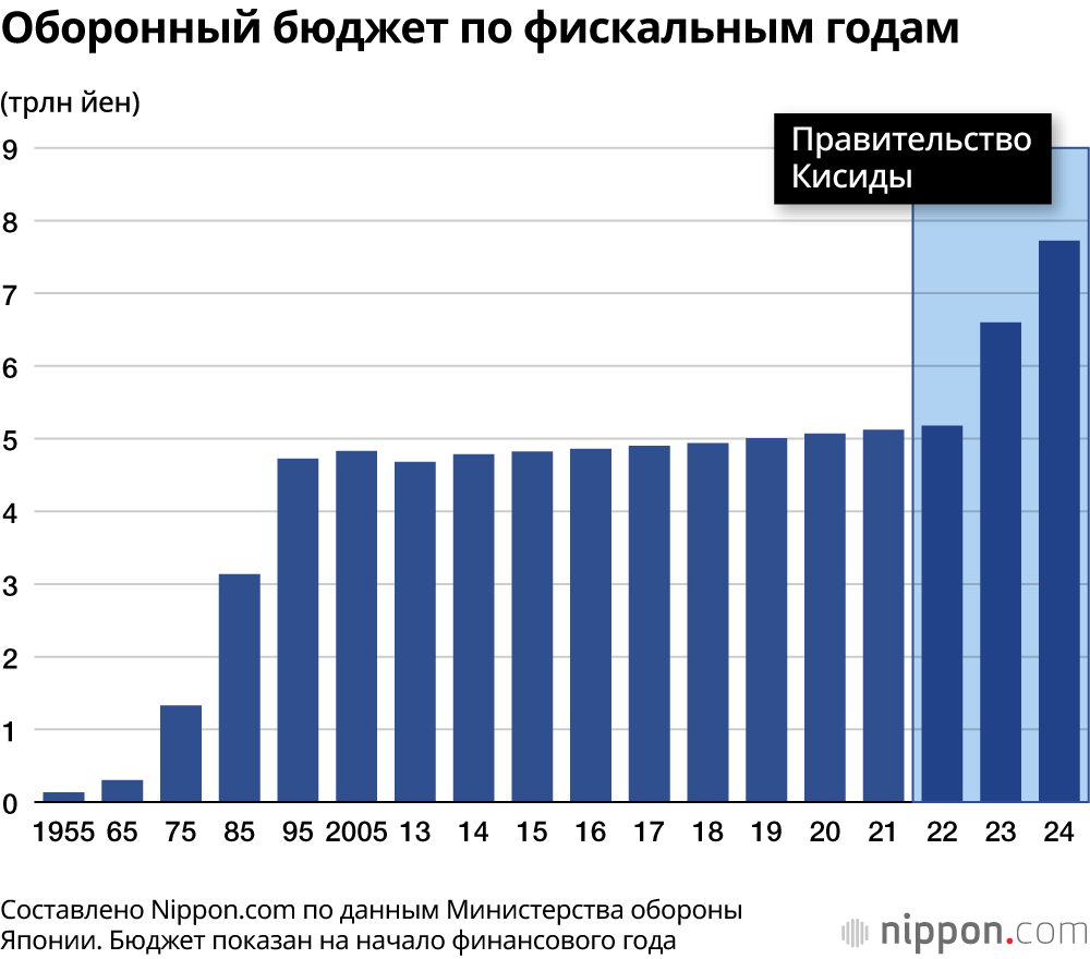 Расходы на оборону Японии ранее планировались на уровне до 1% ВВП. Первый бюджет, предложенный администрацией премьер-министра Кисиды Фумио в 2022 финансовом году, в соответствии с этой политикой составил 5,1 трлн йен, но на 2023 финансовый год бюджет вырос до 6,6 трлн йен, а в бюджете на 2024 финансовый год он увеличился ещё на триллион до 7,7 трлн йен.