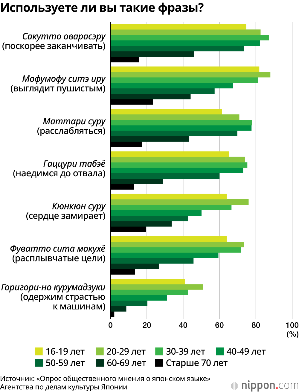 Более половины опрошенных сообщили, что сами иногда используют слова сакутто, мофумофу и маттари, тогда как горигори употребляет не более двадцати процентов людей.