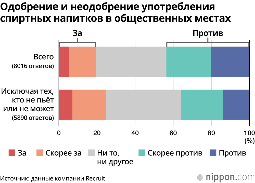 Согласно результатам опроса, проведенного компанией Recruit в начале августа (8016 ответов), на вопрос о том, приходилось ли употреблять алкоголь в общественных местах, таких как парки и улицы, 47,9% опрошенных ответили утвердительно, и 25,6% сказали, что не имеют такого опыта. При этом около 26,5% респондентов не пьют или вообще не могут употреблять алкоголь, так что из употребляющих алкоголь около 65% когда-либо пили в общественных местах.
