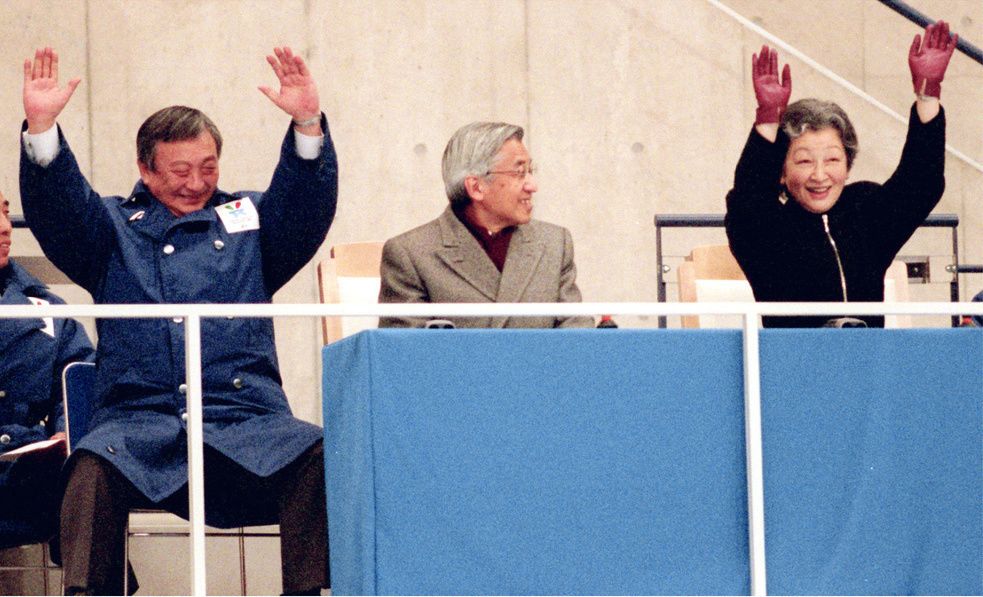 Март 1998 г. Императрица привлекает внимание, присоединяясь к приветствиям зрителей на гонках на санях по льду на Паралимпийских играх в Нагано.