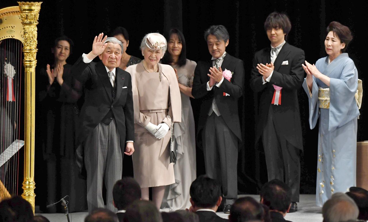 Император Акихито и императрица Митико покидают Национальный театр Японии в Токио после проведения церемонии празднования тридцатой годовщины (© Jiji)