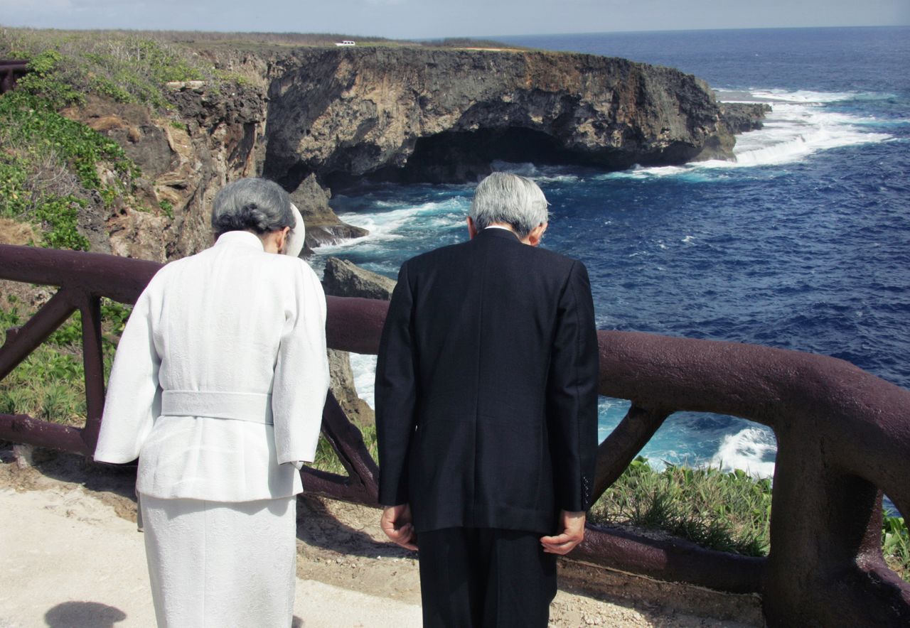 Императрица Митико и император Акихито отдают дань уважения погибшим на скалах Сайпана, где многие японские солдаты и мирные жители бросились в воду и разбились насмерть (© Jiji)