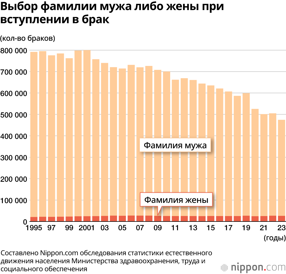 В статье говорится, что супруги должны использовать фамилию либо мужа, либо жены, но, по данным обследования статистики естественного движения населения Министерства здравоохранения, труда и социального обеспечения, среди 474 741 заключённых в Японии брака в 2023 году только в 26 344 случаях супруги выбрали фамилию жены. Для многих женщин необходимость менять фамилию после замужества стала неизбежной проблемой.