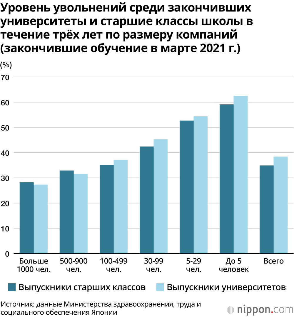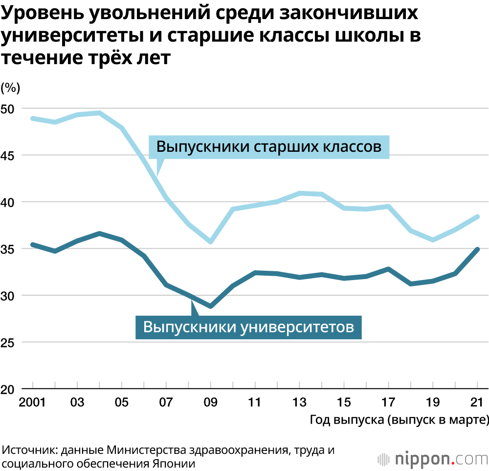 Согласно результатам исследования текучести рабочих мест среди недавно трудоустроенных выпускников, недавно опубликованным Министерством здравоохранения, труда и социального обеспечения, доля людей, окончивших школу в марте 2021 года и уволившихся с работы в течение трёх лет (до марта 2024 года), текучесть кадров росла: число уволившихся выпускников университетов увеличилось на 2,6 пункта по сравнению с предыдущим годом до 34,9%, число выпускников двухлетних колледжей увеличилось на 2,0 пункта до 44,6%, а среди закончивших старшие классы школы уволилось на 1,4 пункта больше, 38,4%. Среди получивших только обязательное среднее образование этот процент снизился на 2,4 пункта до 50,5%.