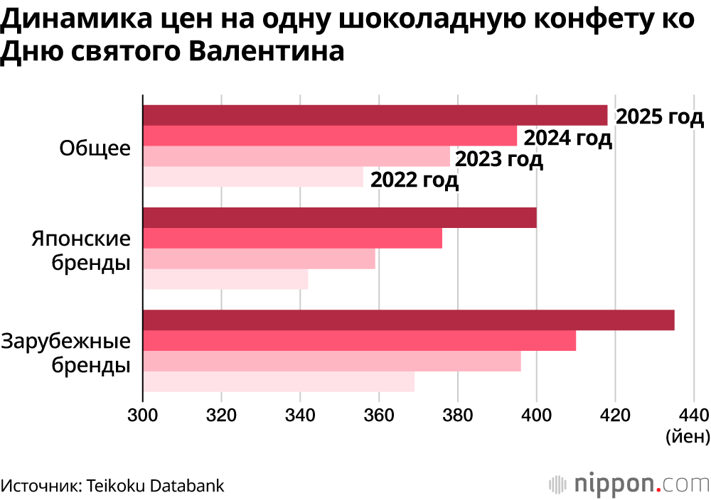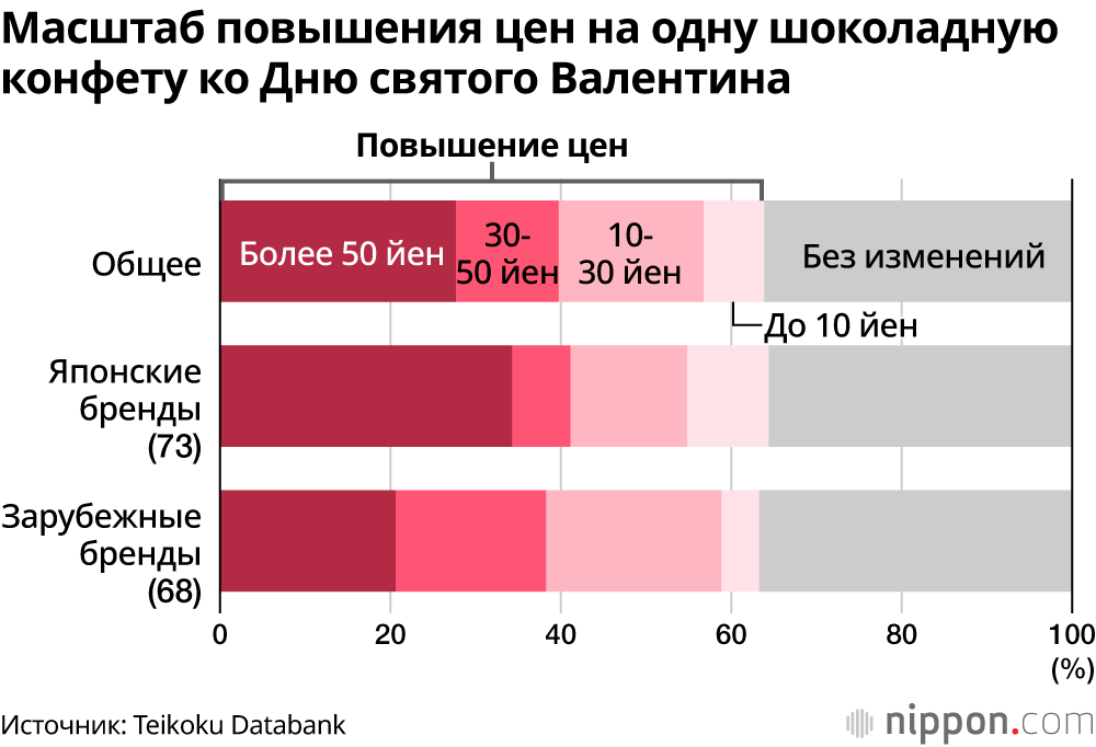 Согласно исследованию компании Teikoku Databank, изучившей цены на шоколад ко Дню святого Валентина от 150 брендов в ведущих универмагах и торговых центрах Японии, средняя стоимость одной конфеты выросла на 23 йены и достигла 418 йен. Импортные конфеты премиальных брендов из Франции и Бельгии подорожали на 25 йен – до 435 йен за штуку. Японские производители также подняли цены на 24 йены – до 400 йен, что стало историческим максимумом.