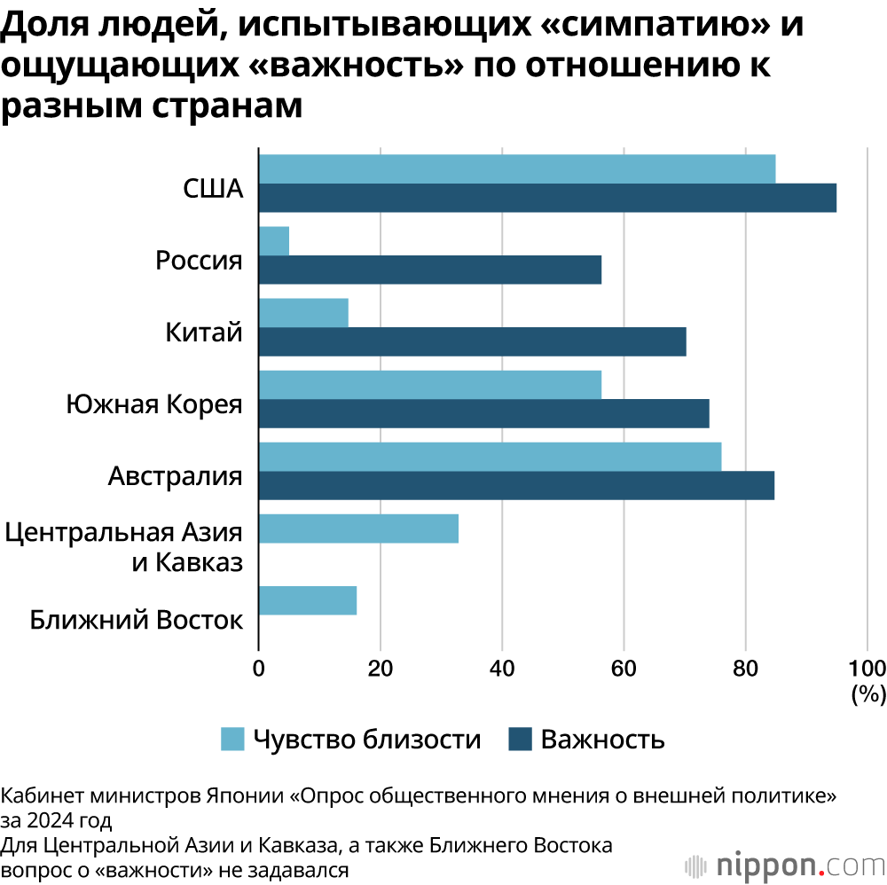 Доля тех, кто «испытывает симпатию», составляет 84,9% в отношении США, 76,0% для Австралии и так далее. По отношению к России этот показатель остался практически на прежнем уровне — 5,0%. В 2010-х годах, когда регулярно проводились встречи на высшем уровне между тогдашним премьер-министром Абэ Синдзо и президентом Путиным, этот показатель держался на уровне около 20%, однако резко упал после вторжения в Украину в феврале 2022 года.