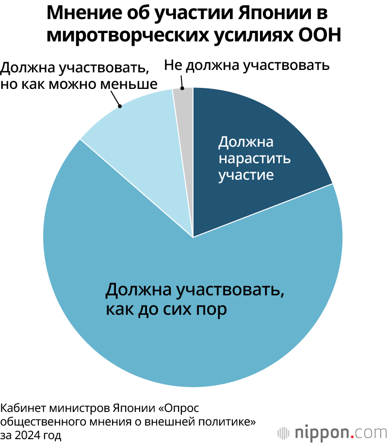 По вопросу о реформе ООН, на вопрос о том, должна ли Япония стать постоянным членом Совета Безопасности, 89,3% респондентов ответили положительно, а 8,5% - отрицательно. Что касается участия в деятельности, предполагающей вклад человеческих ресурсов в международное сообщество, такой как операции по поддержанию мира ООН (ПКО), помощь пострадавшим и наблюдение за выборами, 19,0% ответили «следует участвовать более активно, чем раньше», что на 4,3 процентных пункта меньше, чем в предыдущем опросе, а 65,7% ответили «следует продолжать участвовать на том же уровне, что и раньше», что на 1,3 процентных пункта больше.
